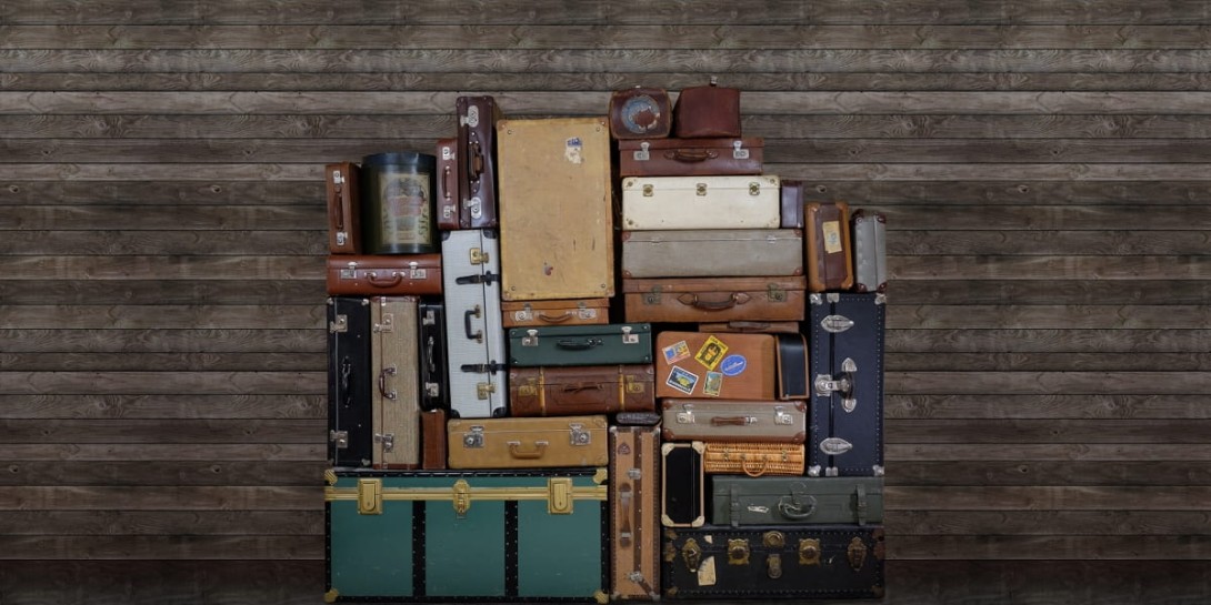 Rebel Walls R14063 Passion Stacked Suitcases Pile - mural imitujący drewniane deski