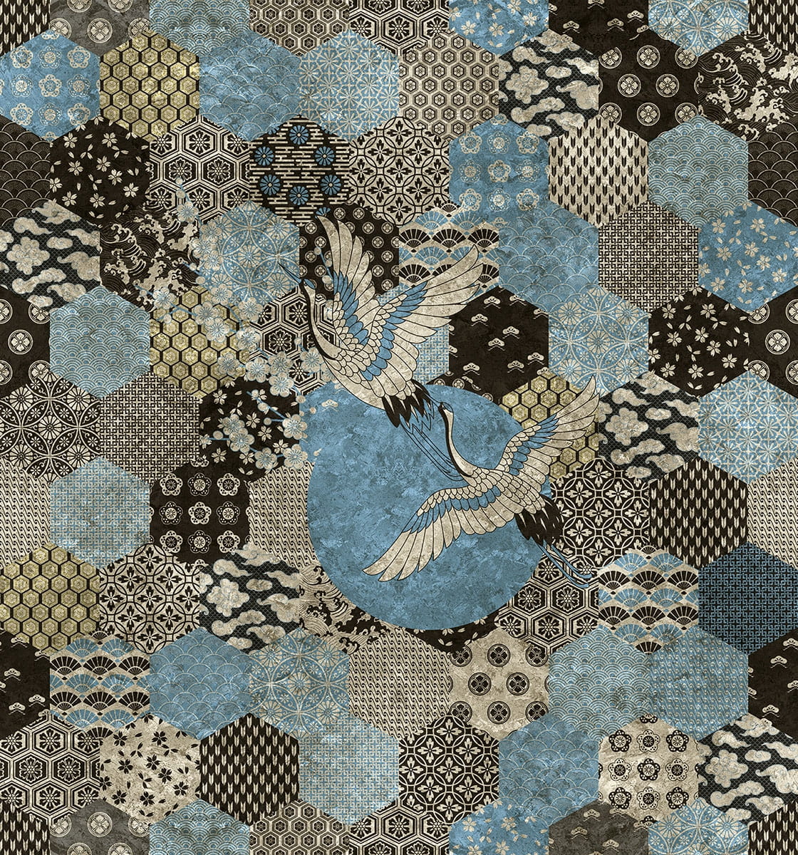 Fototapeta Inkiostro Bianco GoldenWall Kioto INKTWBS1801 to bardzo kreatywny sposób na udekorowanie ściany w dowolnym pomieszczeniu naszego domu lub mieszkania. Niepowtarzalny wzór wypełniony jest heksagonami o niezwykłych walorach estetycznych. Widzimy również dwa lecące żurawie, uznawane za symbol szczęścia i spełnienia. Kolorystyka muralu jest bardzo różnorodna. Znajdziemy tam odcienie złota, brązu oraz orzeźwiającego błękitu. Mural Inkiostro Bianco GoldenWall Kioto INKTWBS1801 wykonana jest z połyskującego materiału. Pięknie rozświetla wnętrza utrzymane w nowoczesnym stylu z wieloma designerskimi dodatkami. Będzie pięknie wyglądać w pomieszczeniach salonu, przedpokoju czy sypialni.