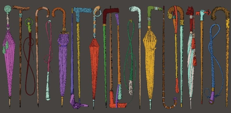 Tapeta zaprojektowana przez Cole & Son przedstawiająca różnorodne parasolki, buty jeździeckie i laski zebrane przez Piero Fornasettiego w ciągu roku i namalowane na stoiskach z parasolami i innymi produktami dekoracyjnymi. Promenade jest drugim z szerokich fryzów Cole & Son zaprojektowanym do wieszania zarówno na dole ściany, jak i pod linią lamperii. Sprzedawany w pojedynczej 10m rolce o szerokości 68.5cm.