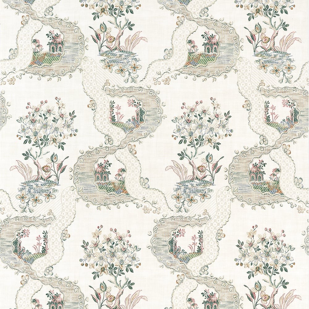 Tapeta Anna French Belvedere Antoinette Beige AT16158 przedstawia wyrafinowany wzór inspirowany klasycznym francuskim brokatem. Dekoracja opiera się na kompozycji stylizowanych scen roślinnych zamkniętych w ornamentalnych ramach przypominających haftowane medale, przeplecionych subtelnym motywem wstęgi. Jasnobeżowe tło w połączeniu z pastelowymi odcieniami błękitu, różu i oliwkowej zieleni buduje wrażenie delikatności, miękkości i klasycznej równowagi. Całość zachwyca precyzyjnym detalem i wyczuciem proporcji, dzięki czemu doskonale komponuje się z aranżacjami w stylu cottage i francuskim. Dekoracyjna struktura wzoru integruje się z otoczeniem, podkreślając charakter wnętrza bez wizualnej przesady. Tapeta powstała na flizelinowym podłożu – klej należy nanosić bezpośrednio na ścianę, co usprawnia proces aplikacji i pozwala uzyskać czysty, profesjonalny efekt. Tapeta Anna French AT16158 Belvedere Antoinette Beige wprowadzi do przestrzeni subtelną elegancję i ponadczasowy urok.