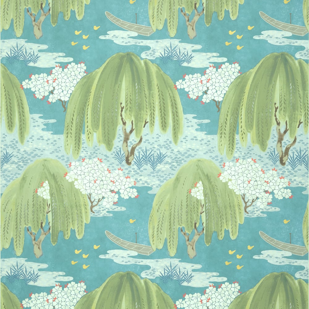 Tapeta Anna French Willow Tree Turquoise AT23109 przyciąga wzrok nastrojowym pejzażem inspirowanym japońskim malarstwem dekoracyjnym z początku XX wieku. Płaczące wierzby, miękkie kontury roślin i rozproszone detale – takie jak łodzie czy nieregularne obłoki – tworzą układ o wyraźnej narracyjności. Turkusowa paleta wnosi świeżość i energetyczny akcent, który przełamuje stonowaną bazę kompozycji. Ręcznie malowany charakter wzoru buduje wrażenie autentyczności i wprowadza artystyczny kontekst do aranżacji. Tapeta Anna French AT23109 Willow Tree Turquoise zachwyca złożoną strukturą graficzną, a jednocześnie zachowuje optyczną lekkość. Dobrze prezentuje się na dużych powierzchniach, gdzie może pełnić funkcję dekoracyjnego tła, nie dominując przy tym przestrzeni. Sprawdzi się w aranżacjach zorientowanych na estetykę wschodnią, ale także w projektach eklektycznych, które łączą klasykę z nowoczesną interpretacją wzoru.