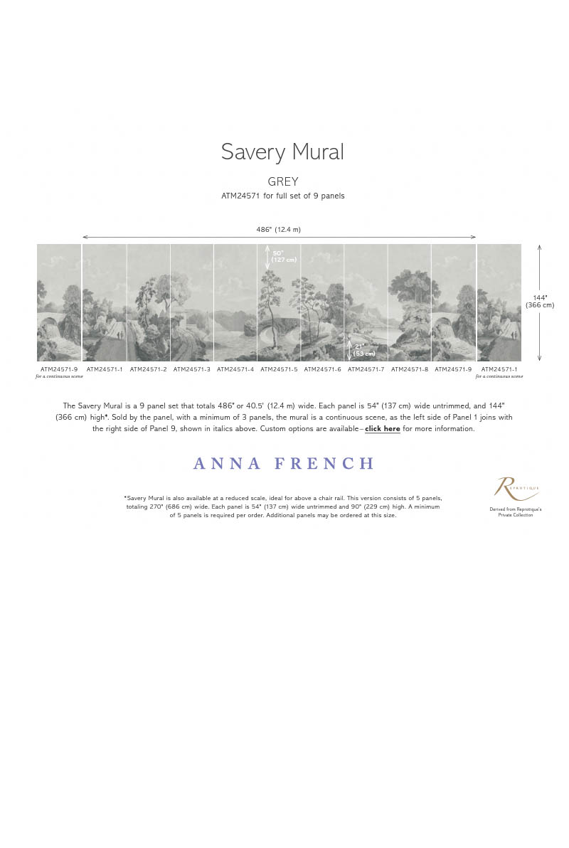 Mural Anna French Devon Savery Mural Grey ATΜ24571 prezentuje malarską scenę krajobrazową w odcieniach przygaszonej szarości inspirowaną klasycznymi panoramami. Kompozycja obejmuje delikatnie zarysowane drzewa, wzgórza, most i postaci wtopione w tło, co tworzy wyważony, harmonijny obraz. Monochromatyczna paleta i subtelne przejścia tonalne budują atmosferę spokoju i refleksji, idealną do przestrzeni wypoczynkowych lub reprezentacyjnych. Mural Anna French ATM24571-3 Devon Savery Mural Grey wprowadzi do wnętrza iluzję głębi i narracyjnego pejzażu, który zachwyca detalem i spokojną ekspresją. Wyrafinowany styl muralu doskonale komponuje się z klasycznym wyposażeniem oraz nowoczesnym minimalizmem, nadając całości dekoracyjnego, ale nie przytłaczającego akcentu. Produkt stanowi jedną z dziewięciu części większej kompozycji i sprzedawany jest w zestawie minimum trzech paneli.