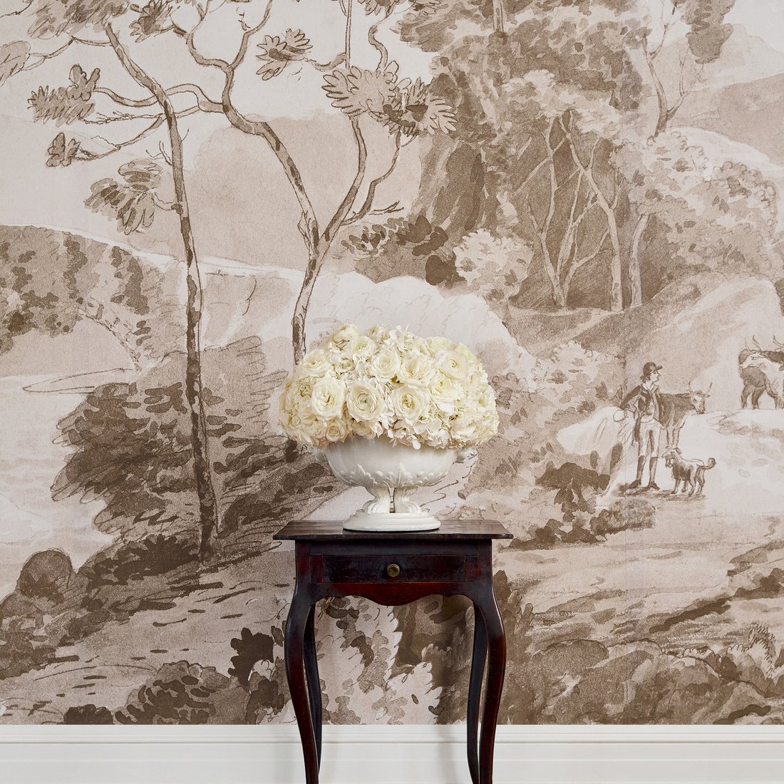 Mural Anna French Devon Savery Mural Grey ATΜ24571 prezentuje malarską scenę krajobrazową w odcieniach przygaszonej szarości inspirowaną klasycznymi panoramami. Kompozycja obejmuje delikatnie zarysowane drzewa, wzgórza, most i postaci wtopione w tło, co tworzy wyważony, harmonijny obraz. Monochromatyczna paleta i subtelne przejścia tonalne budują atmosferę spokoju i refleksji, idealną do przestrzeni wypoczynkowych lub reprezentacyjnych. Mural Anna French ATM24571-9 Devon Savery Mural Grey wprowadzi do wnętrza iluzję głębi i narracyjnego pejzażu, który zachwyca detalem i spokojną ekspresją. Wyrafinowany styl muralu doskonale komponuje się z klasycznym wyposażeniem oraz nowoczesnym minimalizmem, nadając całości dekoracyjnego, ale nie przytłaczającego akcentu. Produkt stanowi jedną z dziewięciu części większej kompozycji i sprzedawany jest w zestawie minimum trzech paneli.