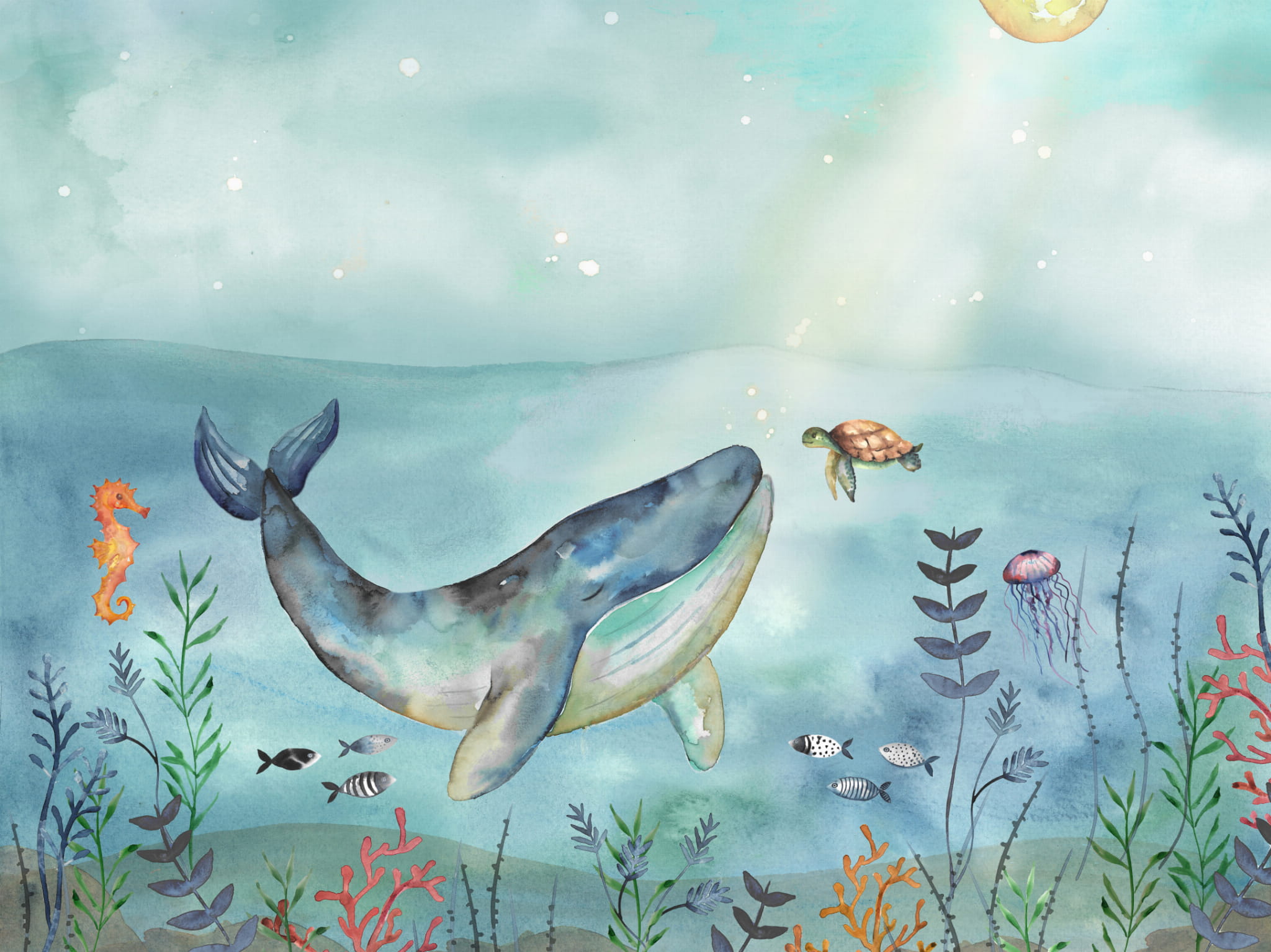 Mural BN Walls Doodleedo Ocean Friends 300441 z podwodnym życiem zwierząt to zaskakująca propozycja do pokoju dziecięcego. Projekt przedstawia niezwykłe życie, jakie toczy się pod wodą oceanu. Wieloryb, żółw, konik morski, meduza, rybki i koralowce zabiorą Twojego malucha do niesamowitego, podwodnego świata, w którym magia spowija każdą chwilę, zamieniając ją w coś niesamowitego. Mural BN Walls Doodleedo Ocean Friends 300441 ocean stworzy uroczą aranżację w towarzystwie białych mebli i jasnego dywanu.