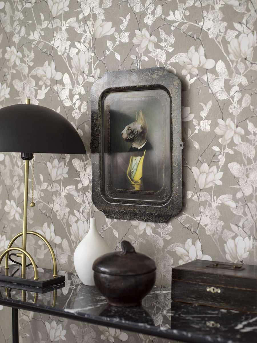 Tapeta Boras Tapeter 7227 Adorn Lily Tree Gray subtelnie oddaje poetykę kwitnącej magnolii, tworząc tło pełne spokoju, klasy i teksturalnego bogactwa. Jasnoszare tony zestawione z delikatnie połyskującym konturem kwiatów budują efekt migotliwej głębi – nieoczywistej, ale wyraźnie obecnej w świetle dziennym. Wzór inspirowany dawną sztuką zdobniczą został uproszczony do formy eleganckiej sylwetki, która działa niczym szept natury na ścianie – cichy, ale znaczący. Tapeta Boras Tapeter Adorn Lily Tree 7227 Gray doskonale wpisuje się w przestrzenie wymagające wyrafinowanego tła: salonów w stylu klasycznym, sypialni o pałacowym sznycie, a także nowoczesnych wnętrz, w których detal ma znaczenie. Zestawiona z perłowymi tkaninami, szlifowanym szkłem lub postarzaną stolarką tworzy atmosferę intymnego luksusu, w której ornament staje się nośnikiem ponadczasowej elegancji.