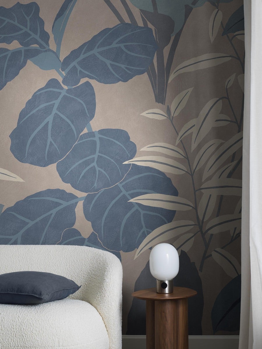 Mural Boras Tapeter Studio Grand Leaves 9625W Blue wprowadza do wnętrz tropikalny klimat w nowoczesnym, graficznym wydaniu. Stylizowane, okazałe liście figowca oraz innych roślin tropikalnych nakładają się na siebie, tworząc wielowymiarową i bogatą warstwowość. Każdy detal: od miękkich konturów liści po ich różnorodną fakturę, harmonijnie kontrastuje z subtelnym tłem. Kolorystyka podkreśla graficzny charakter wzoru, jednocześnie wnosząc do wnętrza wyrafinowaną elegancję. Mural Boras Tapeter 9625W Studio Grand Leaves Blue działa jak wizualne okno do egzotycznej dżungli, idealnie łącząc ekspresję i spokój. Doskonale sprawdzi się zarówno w dużych przestrzeniach, gdzie może dominować, jak i w mniejszych wnętrzach, dodając im głębi i tropikalnej świeżości.