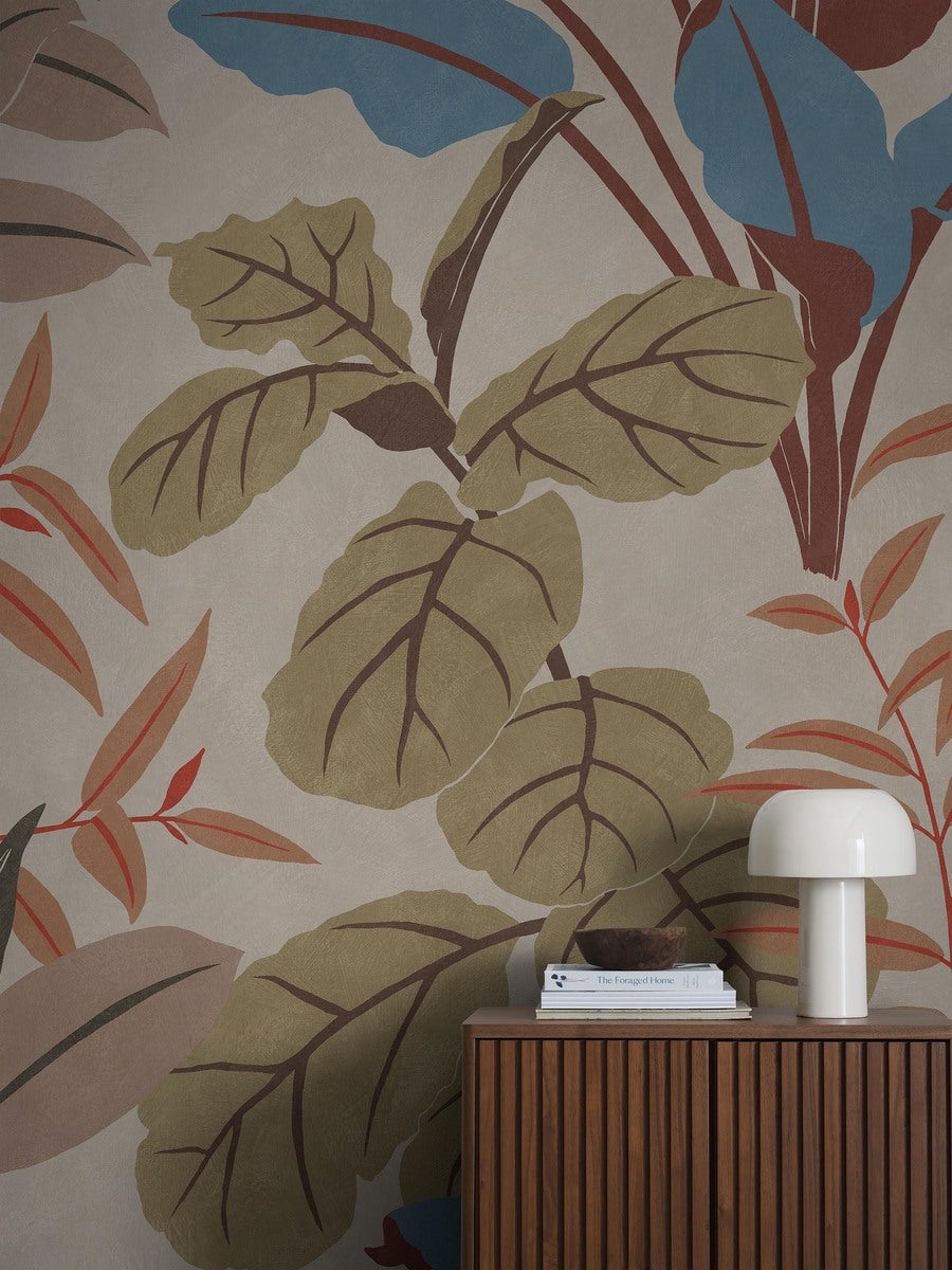 Mural Boras Tapeter Studio Grand Leaves 9629W Multi wprowadza do wnętrz tropikalny klimat w nowoczesnym, graficznym wydaniu. Stylizowane, okazałe liście figowca oraz innych roślin tropikalnych nakładają się na siebie, tworząc wielowymiarową i bogatą warstwowość. Każdy detal: od miękkich konturów liści po ich różnorodną fakturę, harmonijnie kontrastuje z subtelnym tłem. Kolorystyka podkreśla graficzny charakter wzoru, jednocześnie wnosząc do wnętrza wyrafinowaną elegancję. Mural Boras Tapeter 9629W Studio Grand Leaves Multi działa jak wizualne okno do egzotycznej dżungli, idealnie łącząc ekspresję i spokój. Doskonale sprawdzi się zarówno w dużych przestrzeniach, gdzie może dominować, jak i w mniejszych wnętrzach, dodając im głębi i tropikalnej świeżości.