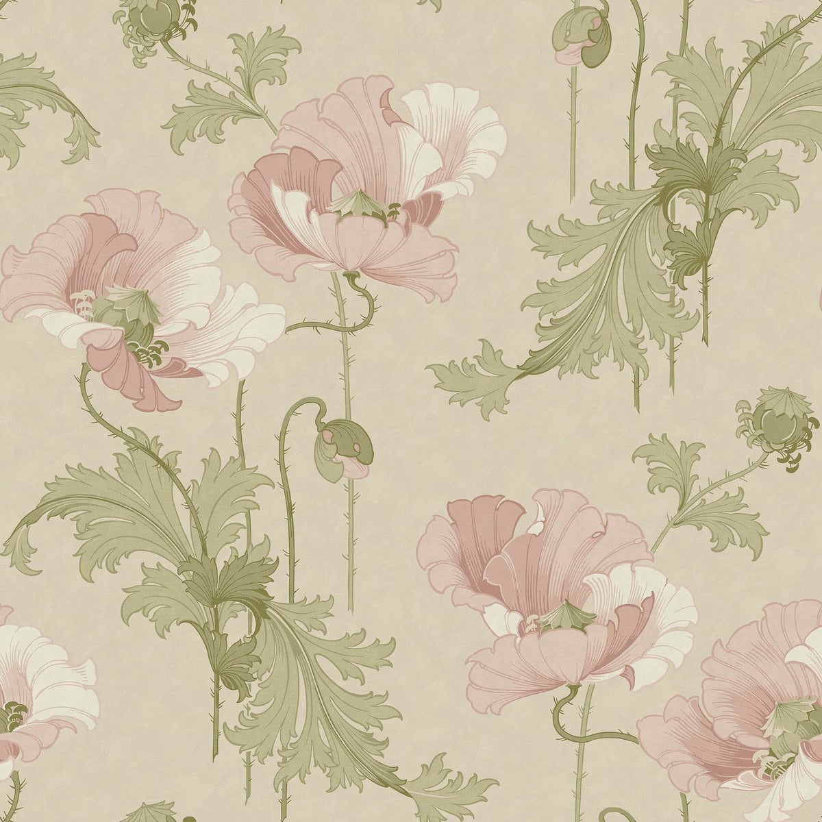 Mural Boras Tapeter Vallmo Grand 9656W Pink otacza wnętrze subtelną elegancją inspirowaną secesją. Pudroworóżowe maki delikatnie rozkwitają na jasnobeżowym tle, tworząc harmonijną, lekką kompozycję. Limonkowozielone liście i finezyjne pąki dodają świeżości, wprowadzając do przestrzeni miękkość i naturalny rytm. Powierzchnia muralu z dyskretnym efektem tekstylnym subtelnie rozprasza światło, nadając ścianom wyrafinowany, przytulny charakter. W większej skali wzór nabiera jeszcze większej ekspresji, podkreślając dekoracyjny wymiar przestrzeni. Precyzyjny nadruk cyfrowy gwarantuje doskonałą jakość detali i możliwość dopasowania do ściany, tworząc spójny, dopracowany efekt. Mural Boras Tapeter 9656W Vallmo Grand Pink w tej odsłonie świetnie komponuje się z jasnymi wnętrzami, dodając im romantycznej delikatności i klasycznej harmonii.