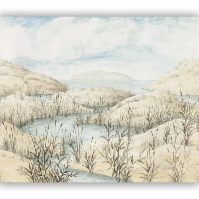Mural Casadeco SENT200971207 Sentier Des Dunes Chemin Cotier Lin to urokliwe odwzorowanie słonych bagien w wielkoformatowej odsłonie, która wprowadza do wnętrza dziką, a zarazem spokojną atmosferę nadmorskiego krajobrazu. Sceneria przedstawia trzciny delikatnie wijące się wzdłuż naturalnego, zaimprowizowanego kanału pod niebem pełnym chmur. Każdy element kompozycji oddaje subtelny rytm natury, tworząc harmonijny i malowniczy widok. Mural Casadeco 200971207 Sentier Des Dunes Chemin Cotier Lin doskonale łączy dzikość przyrody z jej łagodnością, wprowadzając do wnętrza element spokoju i świeżości.