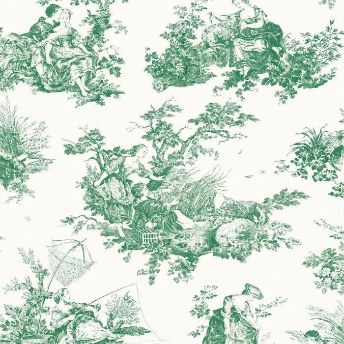 Casadeco 87917272 Les Belles Toiles de Jouy 2 Scène d’été Vert amande - tapeta w scenki rodzajowe