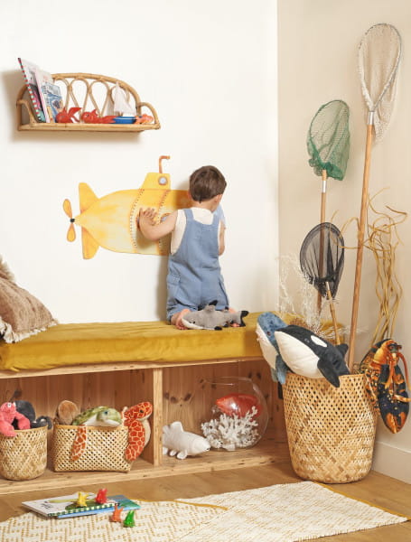 Mural Casadeco Once Upon A Time 2 Yellow Submarine Spray Up Jaune OUTD 20099 23 23 przedstawia dużą, kolorową łódź podwodną, która doda przestrzeni ciekawego pierwiastka. Dekoracja urozmaici pokój dziecięcy, ale bez efektu przytłoczenia. Wzór jest doskonale zrównoważony - jest na tyle interesujący, aby pobudzać wyobraźnię dziecka, ale jednocześnie jest subtelny i delikatny, co sprawia, że wprowadzi harmonię do pomieszczenia. Ten model doskonale pasuje do jasnych, naturalnych wnętrz, w których dominują drewniane meble oraz pastelowe dodatki. Świetnie komponuje się z miękkimi tekstyliami i dekoracjami inspirowanymi podwodnym światem. Mural Casadeco OUTD 200992323 Once Upon A Time 2 Yellow Submarine Spray Up Jaune jest znakomitym wyborem dla rodziców, którzy szukają dekoracji o wyjątkowej estetyce, która jednocześnie wspiera rozwój wyobraźni i tworzy miejsce sprzyjające odpoczynkowi.