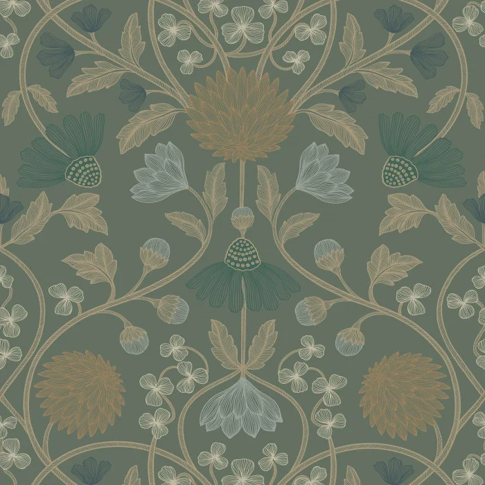 Tapeta Casamance Isadora Hippolyte Vert de gris/doré 7045 07 12 przedstawia dekoracyjną kompozycję inspirowaną paryskimi pasażami, gdzie lekkość światła współgra z precyzyjną, XIX-wieczną ornamentyką. Złożony układ roślinnych detali tworzy rytm, który subtelnie porządkuje przestrzeń i wzmacnia poczucie harmonii. Filigranowe kwiaty układają się w strukturę o wyraźnej symetrii, co sprzyja eleganckiemu odbiorowi wnętrza oraz buduje wrażenie łagodnej ciągłości wzoru. Delikatny połysk wzbogaca powierzchnię o refleksy przypominające świetlne muśnięcia na szklanych dachach historycznych galerii, co wprowadza głębię oraz szlachetność. Flizelinowy podkład świadczy o wysokiej jakości produktu i usprawnia montaż. Tapeta Casamance 7045 07 12 Isadora Hippolyte Vert de gris/doré oferuje pełen finezji klimat vintage, który definiuje przestrzeń subtelnym, ponadczasowym rytmem.