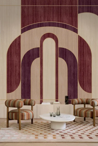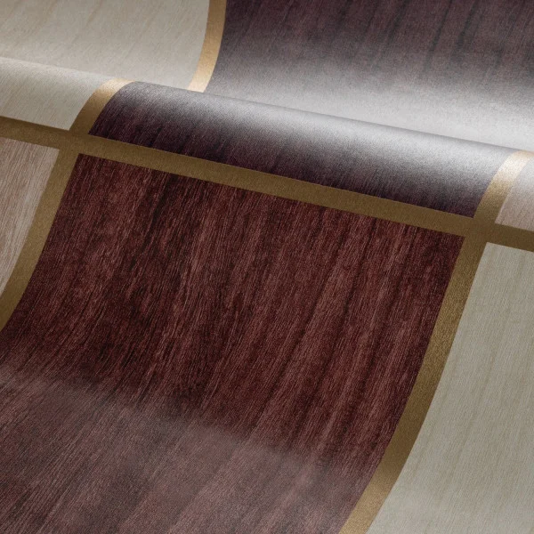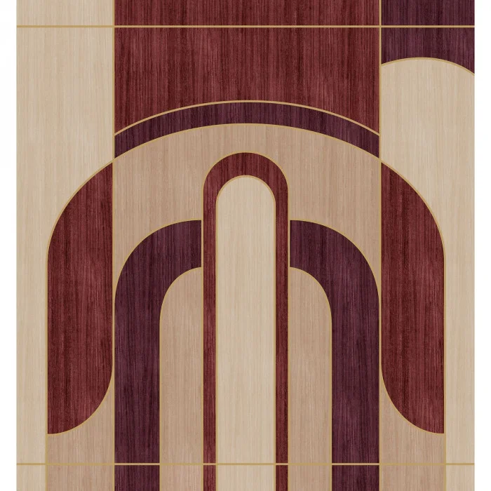 Mural Casamance Panoramas Les Intemporels Alcoves Grège/pourpre 7119 08 14 przedstawia wyważony układ zaokrąglonych form inspirowanych architektonicznymi niszami, które tworzą rytmiczną, elegancką strukturę na ścianie. Harmonijnie poprowadzone łuki porządkują przestrzeń i budują wrażenie głębi, a delikatne, złote linie podkreślają przebieg geometrii oraz dodają subtelnego blasku. Powierzchnia o charakterze forniru orzechowego wprowadza ciepło i szlachetność, dzięki czemu mural staje się dekoracją o przyjemnym, luksusowym wyrazie. Podkład flizelinowy stabilizuje panel i usprawnia montaż, co przekłada się na wysoki komfort aranżacji. Wzór znakomicie współpracuje z rzeźbiarskimi formami, naturalnym drewnem i miękkimi tkaninami. Mural Casamance 7119 08 14 Panoramas Les Intemporels Alcoves Grège/pourpre dodaje wnętrzu architektonicznej harmonii, wyciszonej elegancji i nowoczesnej szlachetności.