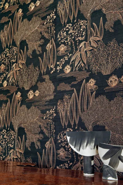 Tapeta Casamance Hikari Hasu Noir cuivré 71360107 jest kwintesencją luksusu. Piękny, roślinny wzór - który przedstawia lilie wodne w otoczeniu wierzb, irysów i jaśminu - został stworzony techniką haftu. Podkładem jest znana i kochana w aranżacjach wnętrz i modzie wiskoza, która jest nie tylko wytrzymała, ale i przyjazna dla środowiska. Projekt nawiązuje do kultury japońskiej, w której ogrody są niezwykle modnym motywem. Dekoracja wniesie w przestrzenie dalekowschodnią elegancję. Wykorzystanie roślin w aranżacjach dodaje pomieszczeniom energii oraz przytulności. Casamance 71360107 Hikari Hasu Noir cuivré - tapeta haftowana w ogród japoński stworzona jest dla fanów wyrafinowanych dodatków. Dostępna jest jeszcze w 2 innych wersjach kolorystycznych. Haft na ścianie na pewno zrobi wrażenie i skupi na sobie uwagę - idealnie pasować będzie do wnętrz w stylu nowoczesnym i japońskim.
