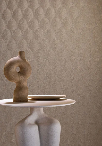 Tapeta Casamance Ecrin Tourmaline Taupe 7578 15 28 prezentuje stylizowany motyw liści palmowych ułożonych w powtarzalny, wachlarzowy rytm charakterystyczny dla estetyki art deco. Misterna sieć drobnych linii tworzy elegancką, rzeźbiarską strukturę wzmacniającą efekt światłocienia, co nadaje ścianie subtelną głębię i uporządkowany, architektoniczny charakter. Regularność wzoru harmonizuje z prostymi bryłami mebli, naturalnymi materiałami oraz matowymi powierzchniami, budując spójną i wyważoną kompozycję. Dekoracyjny rytm liści działa jak wyrafinowany akcent, który definiuje atmosferę wnętrza bez przytłaczania przestrzeni. Winyl na podkładzie flizelinowym gwarantuje odporność na uszkodzenia, wygodne czyszczenie oraz łatwy montaż. Tapeta Casamance 7578 15 28 Ecrin Tourmaline Taupe podkreśla estetykę aranżacji poprzez klarowną geometrię liści i dopracowaną, teksturalną głębię.