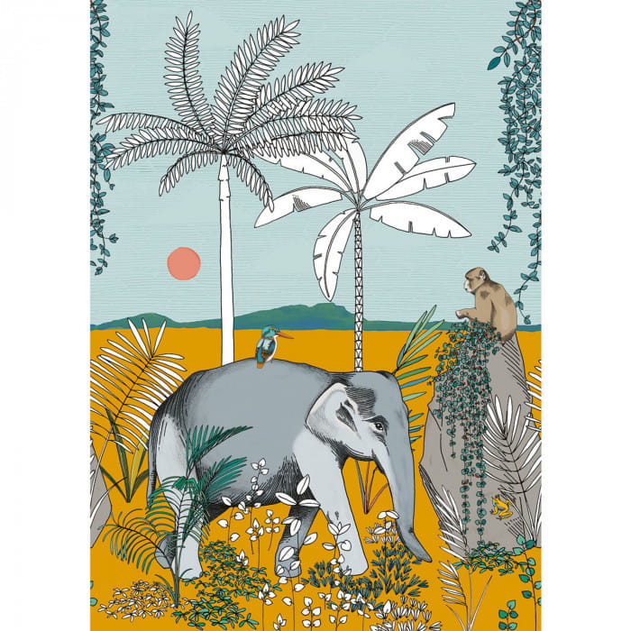 Wielkoformatowy mural Caselio Mystery 101652107 Secret Trip przedstawia egzotyczną wyspę w nieco bajkowym wydaniu. Jaskrawa pustynia na tle której widzimy zarysy gór, kolorowa roślinność wśród której przechadza się słoń z małym towarzyszem na plecach, małpka przesiadująca na kamieniu. Wszystko to tworzy niezwykle kreatywny mural Caselio 101652107 Mystery Secret Trip, który z powodzeniem możemy wprowadzić na ścianę swojego wnętrza