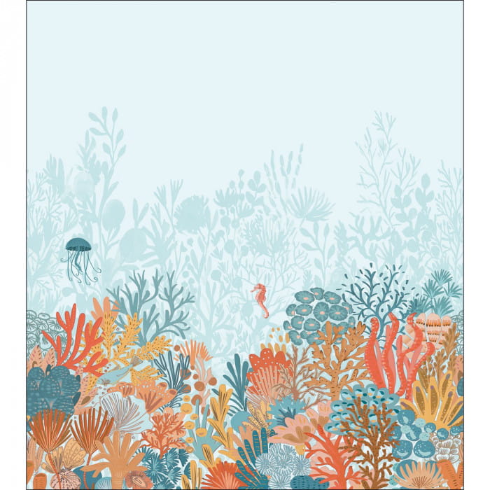 Mural Caselio Pimp My Wall 104906001 Magic Seafloor M to idealny sposób na wniesienie spokoju i harmonii do wnętrza, który zapewnia domownikom wrażenie bycia pod wodą, bez konieczności nurkowania. Projekt ukazuje fascynującą morską toń, gdzie podwodne rośliny i koralowce stworzyły zapierający dech w piersiach krajobraz na dnie morskim. Każdy szczegół tego ręcznie rysowanego wzoru został starannie zaprojektowany, aby oddać piękno rafy koralowej i życia podwodnego. Styl nowoczesny i minimalistyczny tego muralu doskonale komponuje się z różnymi aranżacjami wnętrz, dodając pomieszczeniu elegancji i świeżości, dlatego doskonale sprawdzi się na ścianie akcentowej w sypialni i salonie. Mural Caselio Pimp My Wall 104906001 Magic Seafloor M dostępny jest w dwóch wersjach kolorystycznych i trzech rozmiarach.
