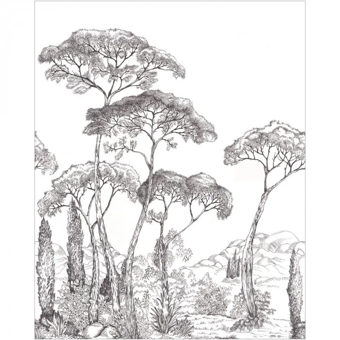Mural Caselio Moonlight 3 Forest of Pines Noir et blanc MNL3107290905 przedstawia las sosen piniowych ujęty w formie precyzyjnego, ilustracyjnego rysunku inspirowanego klasyczną grafiką pejzażową. Smukłe pnie i rozłożyste korony drzew budują rytmiczną kompozycję, która porządkuje powierzchnię ściany i wprowadza czytelną głębię przestrzenną. Czarno-biała stylistyka podkreśla strukturę drzew oraz starannie opracowane detale, zachowując lekkość i wizualną równowagę nawet na dużych płaszczyznach. Motyw rozwija się pionowo, co wzmacnia wrażenie wysokości i naturalnej skali krajobrazu. Ilustracyjny charakter wzoru sprzyja aranżacjom opartym na naturze i spokojnej narracji wizualnej. Flizelinowy podkład zapewnia stabilność oraz precyzję montażu. Mural Caselio MNL3107290905 Moonlight 3 Forest of Pines Noir et blanc wnosi do wnętrza wyciszony pejzaż leśny, oparty na rytmie drzew, klarownej kresce i ponadczasowej elegancji.
