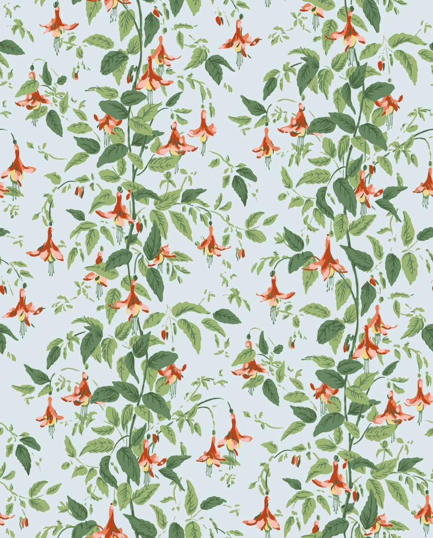 Tapeta Cole & Son 128/6029 Classics Collection Vol. II Fuchsia Coral and Leaf Green on Powder Blue to wzór, który w niezwykle malarski sposób ukazuje urok roślinnego świata. Charakterystyczne dla fuksji dzwonkowate kwiaty o wydłużonych płatkach zwisają na cienkich gałązkach, otoczone bogatym, zielonym listowiem. Tapeta Cole & Son Classics Collection Vol. II Fuchsia 128/6029 Coral and Leaf Green on Powder Blue emanuje lekkością – kwiaty przypominają kompozycję uchwyconą w ruchu, niczym w deszczowym ogrodzie, gdzie natura pulsuje rytmem pełnym gracji i harmonii.. Ten roślinny motyw sprawdzi się zarówno w klasycznych, jak i nowoczesnych aranżacjach, wprowadzając atmosferę pełną subtelnego uroku i naturalnego piękna, idealną do salonów, sypialni czy przestrzeni o artystycznym klimacie.
