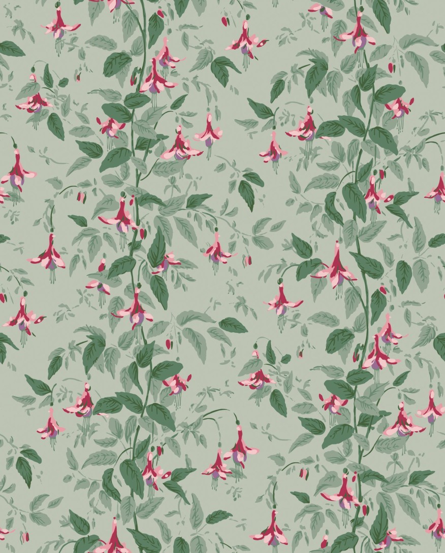 Tapeta Cole & Son 128/6031 Classics Collection Vol. II Fuchsia Dusty Rose and Pale Sage on Soft Laurel prezentuje romantyczny, roślinny wzór, w którym splatają się gałązki z delikatnymi kwiatami fuksji. Zwisające, dzwonkowate płatki w odcieniu pudrowego różu kontrastują z subtelną zielenią liści, tworząc kompozycję o lekko nostalgicznej aurze. Tapeta Cole & Son Classics Collection Vol. II Fuchsia 128/6031 Dusty Rose and Pale Sage on Soft Laurel przywołuje wrażenie ogrodu uchwyconego w porannym świetle, gdzie każdy detal roślin wydaje się pełen harmonii i naturalnej elegancji. Stonowana paleta barw nadaje całości miękkości i wyrafinowania, dzięki czemu wzór idealnie sprawdza się w przestrzeniach, które wymagają nastrojowej, a jednocześnie klasycznej dekoracji.