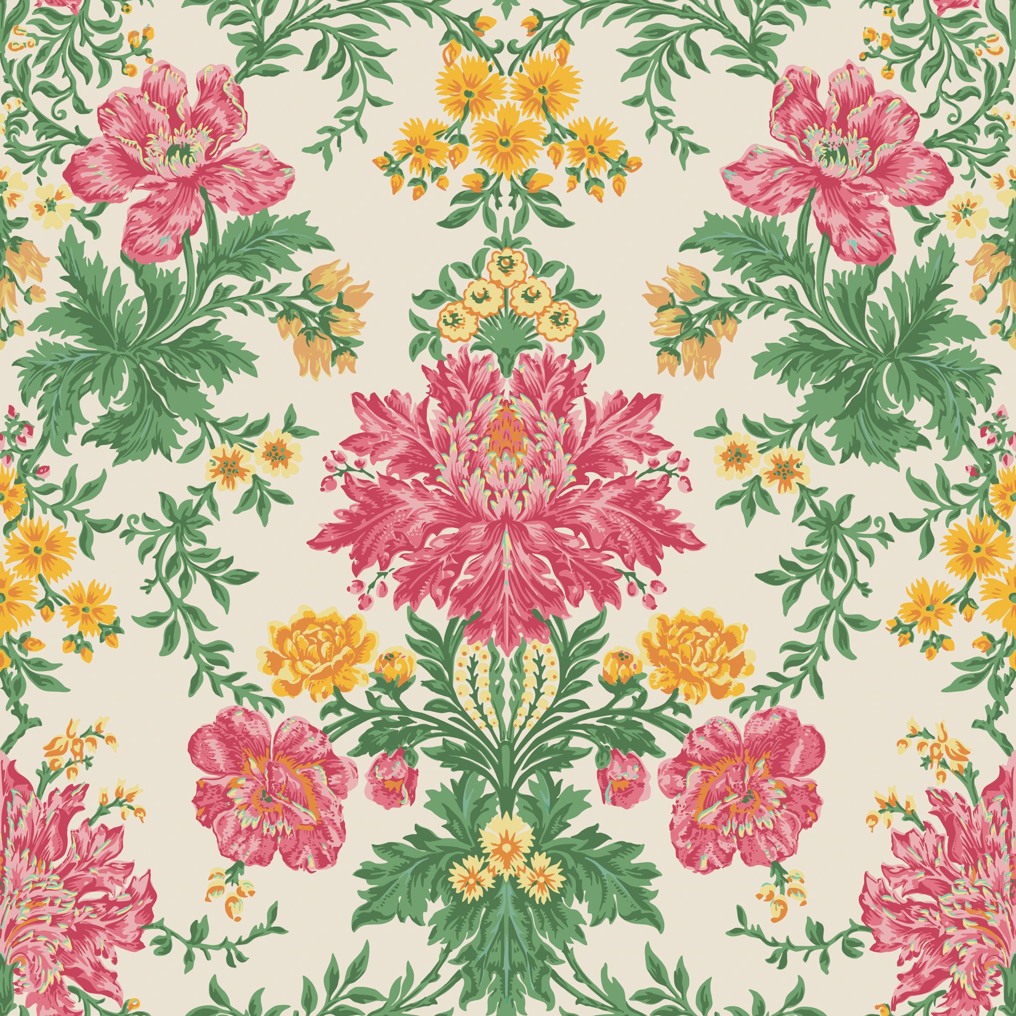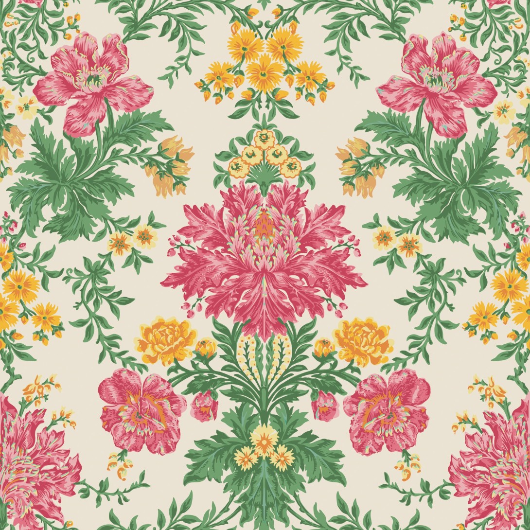 Tapeta Cole & Son 128/7033 Classics Collection Vol. II Poppies Soft Fuchsia, Buttercup and Fern on Cream prezentuje ornamentalny wzór inspirowany damasceńskimi tkaninami, w którym główną rolę odgrywają rozłożyste kwiaty maków zestawione z misternie opracowanymi liśćmi. Powtarzalny układ motywu wprowadza rytm i symetrię, nadając kompozycji pałacowy charakter, a subtelne odcienie różu, żółci i zieleni podkreślają jej dekoracyjny wymiar. Tapeta Cole & Son Classics Collection Vol. II Poppies 128/7033 Soft Fuchsia, Buttercup and Fern on Cream nawiązuje do estetyki vintage, łącząc klasyczny ornament z ponadczasową elegancją. Jej wyrazisty, a zarazem wysublimowany styl sprawia, że wnętrze nabiera uroczystego klimatu przypominającego dawne rezydencje i arystokratyczne salony. To wybór dla przestrzeni, w których oczekuje się efektu wyszukanej dekoracyjności, gdzie motyw florystyczny staje się centralnym elementem aranżacji.