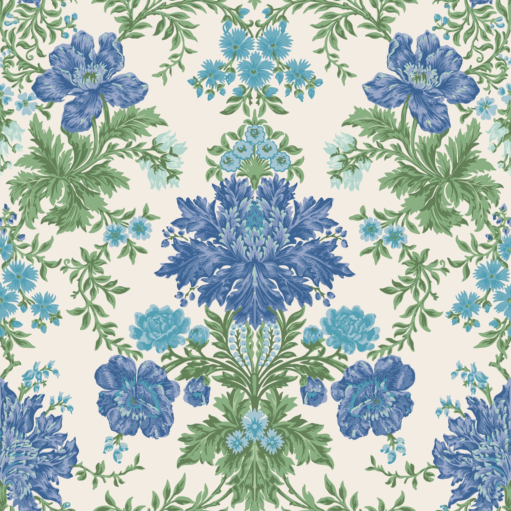 Tapeta Cole & Son 128/7035 Classics Collection Vol. II Poppies Sapphire, Cerulean and Moss on Stone prezentuje ornamentalny wzór roślinny, w którym maki zostały ujęte w formie stylizowanego damaszku. Duże, pełne kwiaty i rozbudowane, bogato cięte liście tworzą symetryczny układ o charakterze dekoracyjnej tkaniny, nawiązującej do tradycji królewskich wnętrz. Tapeta Cole & Son Classics Collection Vol. II Poppies 128/7035 Sapphire, Cerulean and Moss on Stone wyróżnia się chłodną paletą barw - głębia szafiru, delikatność błękitu ceruleum i naturalna tonacja mchu subtelnie kontrastują z kamiennym tłem, nadając całości wyważonej elegancji. Wzór emanuje uroczystością i pałacowym majestatem, jednocześnie zachowując ponadczasowy urok vintage. Idealnie sprawdzi się w przestrzeniach klasycznych, salonach w stylu art déco lub we wnętrzach eklektycznych, gdzie stanie się centralnym punktem aranżacji, nadając im prestiżowy i pełen charakteru wyraz.