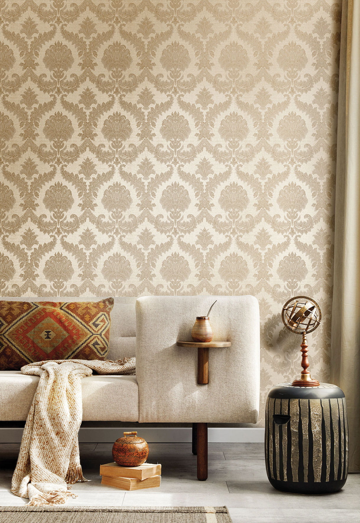 Tapeta Cristiana Masi Vintage 25720 to wyjątkowa dekoracja ścienna, która prezentuje klasyczne, roślinne ornamenty. Model ten wprowadzi do wnętrza elegancję i ponadczasowy szyk. Wzór inspirowany tradycyjnymi motywami roślinnymi idealnie współgra z przestrzeniami urządzonymi w stylu klasycznymi lub vintage. Detale ornamentów, wykończone z mistrzowską precyzją, przyciągają wzrok i tworzą harmonijną kompozycję, która jest doskonałym tłem dla różnorodnych aranżacji. Tapeta Cristiana Masi Vintage 25720 sprawdzi się w salonach, gabinetach czy jadalniach. Do każdego miejsca wprowadzi subtelne, ale luksusowe wykończenie. Jej wzornictwo doskonale komponuje się z antykami, jak i z bardziej współczesnymi, minimalistycznymi dodatkami, tworząc harmonijną przestrzeń w stylu eklektycznym.