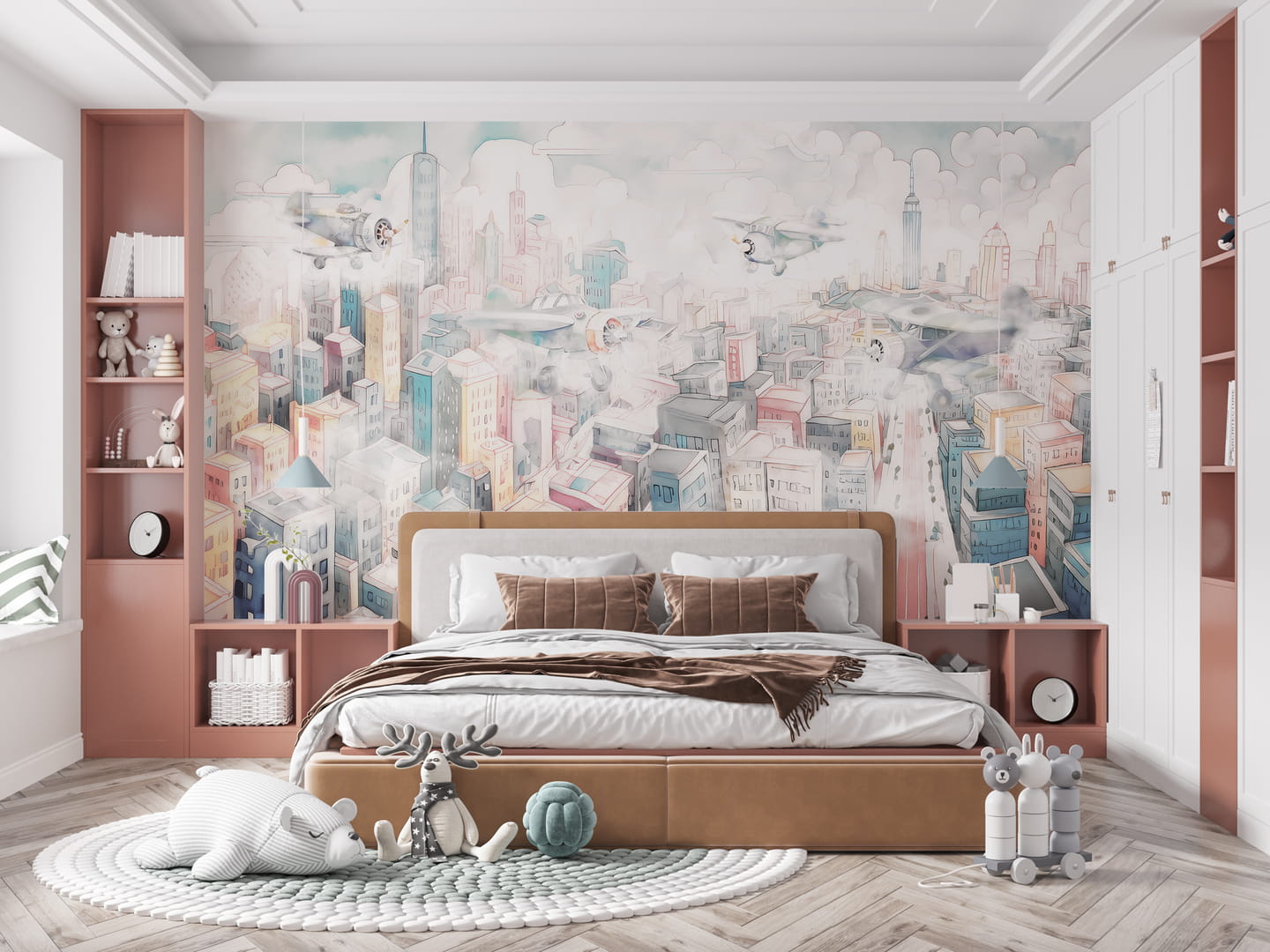 Mural Dekorami Airshow 1 ma dynamiczny charakter. Prezentuje miasto z lotu ptaka, nad którym latają samoloty. Nadaje się zarówno do pokoju najmłodszych, jak i nastolatków, którzy marzą o podróżach i przygodach. Dekoracja wniesie do wnętrza odrobinę akcji, zachęcając do odkrywania nowych przestrzeni i rozwijania wyobraźni. Jej kompozycja pozytywnie wpłynie na optykę pomieszczenia. Idealnym uzupełnieniem aranżacji z muralem Dekorami Airshow 1 będą nowoczesne meble o prostych formach, takie jak biurka z metalowymi nogami, półki na książki w minimalistycznym stylu oraz łóżka z prostymi, geometrycznymi zagłówkami. Dodatki w postaci poduszek w kształcie samolotów lub dekoracyjnych globusów znakomicie uzupełnią całość. Warto też dodać plakaty na ścianach czy lampy inspirowane nowoczesnym designem, które zintegrują się z architektonicznym stylem muralu. Motyw samolotów i dużego miasta zachęca do kreatywnej zabawy oraz nauki, inspirując młodych odkrywców do marzeń o podróżach i przygodach w przestworzach.
