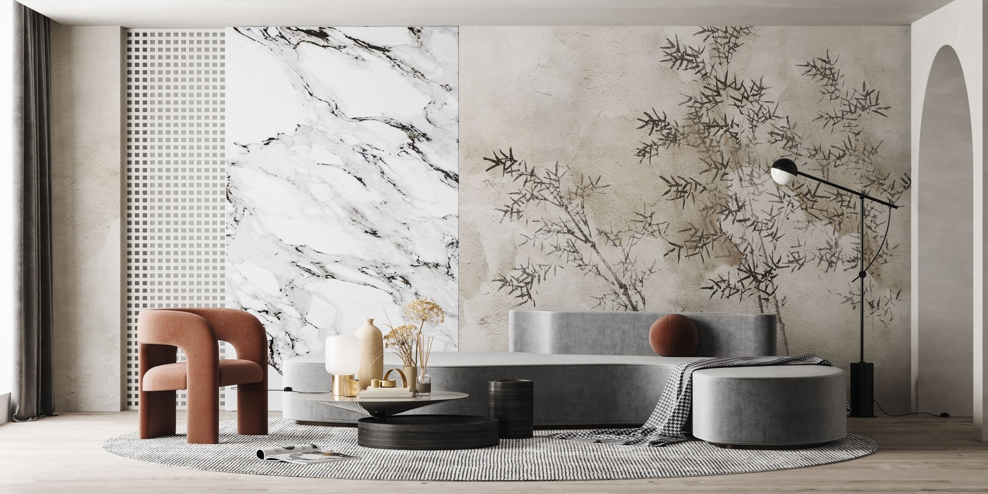Mural Dekorami Echo 3 przedstawia kontrastowy układ gałęzi osadzonych na surowym, betonowym tle o zimnej tonacji. Monochromatyczna paleta utrzymana w chłodnych szarościach podkreśla techniczny charakter wzoru i wzmacnia minimalistyczny przekaz. Delikatne rysunki liści wpisane w teksturę przypominającą tynk architektoniczny idealnie komponują się z nowoczesnymi, industrialnymi przestrzeniami oraz estetyką organic modern. Mural Dekorami Echo 3 dobrze współgra z materiałami naturalnymi, stalą, betonem architektonicznym, a także szkłem i lamelami. Może być zastosowany w gabinecie, przedpokoju, salonie oraz komercyjnie – w lobby biurowym lub hotelowym. Wyważony graficznie zapewnia efekt tła dekoracyjnego bez dominacji wizualnej. Sprawdzi się w projektach wymagających równowagi między naturalnym detalem a współczesną estetyką wykończenia.