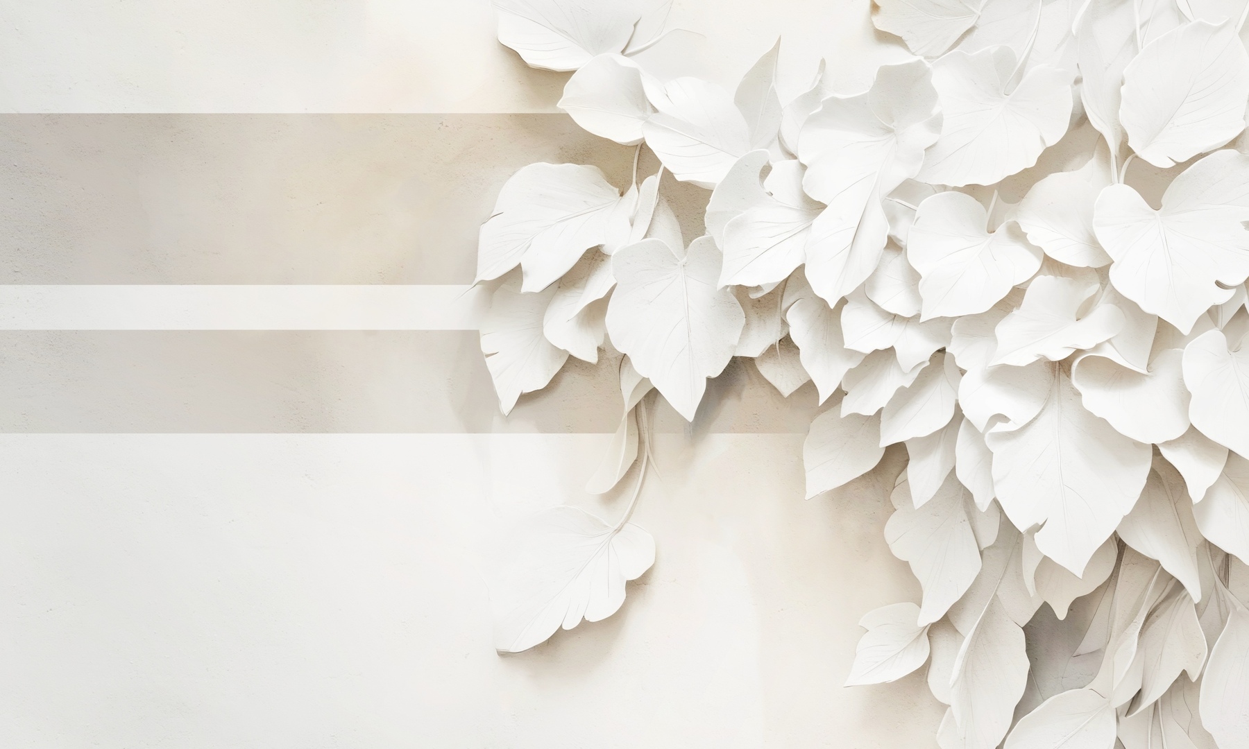 Mural Dekorami Illusion 2 prezentuje zjawiskową interpretację liści wpisanych w nowoczesny rytm poziomych pasów. Przestrzenne, rzeźbiarsko odwzorowane kształty przyciągają wzrok detalami, które przypominają misternie formowaną instalację artystyczną. Kompozycja zachwyca czystością formy, gdzie biel i piaskowe odcienie tworzą subtelny kontrast, nadający wnętrzu poczucie porządku i harmonii. Strukturalna głębia liści przywołuje naturalność w eleganckiej, uproszczonej odsłonie, idealnie komponującej się z wystrojem opartym na nowoczesnych materiałach i stonowanej palecie. Mural Dekorami Illusion 2 harmonijnie współgra z wnętrzami w stylu nowoczesnym i skandynawskim, stanowiąc mocny akcent dekoracyjny, który nie przytłacza, a definiuje przestrzeń. Wzór odnajduje się w przestrzeniach komercyjnych i prywatnych.