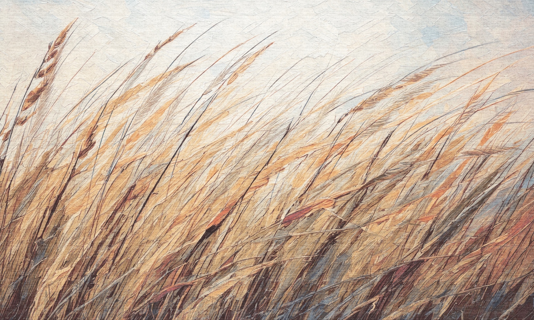 Mural Dekorami Shum 2 emanuje energią późnego lata, uchwyconą w dynamicznym ujęciu kołyszących się kłosów. Złociste źdźbła zbóż przeplatają się z delikatnymi pasmami ciepłych brązów, rudości i przygaszonych błękitów, tworząc sugestywną kompozycję inspirowaną naturą. Każda linia przypomina szkic wykonany pewną ręką, co podkreśla malarską estetykę wzoru. Mural Dekorami Shum 2 przyciąga ruchem, który sprawia wrażenie falowania – zupełnie jakby ściana oddychała rytmem wiatru. Zastosowana paleta podkreśla naturalność wnętrza, wprowadzając do aranżacji zarówno światło, jak i organiczną głębię. Wzór idealnie współgra z drewnem, ceramiką i miękkimi tkaninami. Sprawdza się w aranżacjach boho, rustykalnych oraz skandynawskich, gdzie estetyka wyciszenia łączy się z artystycznym wyrazem.