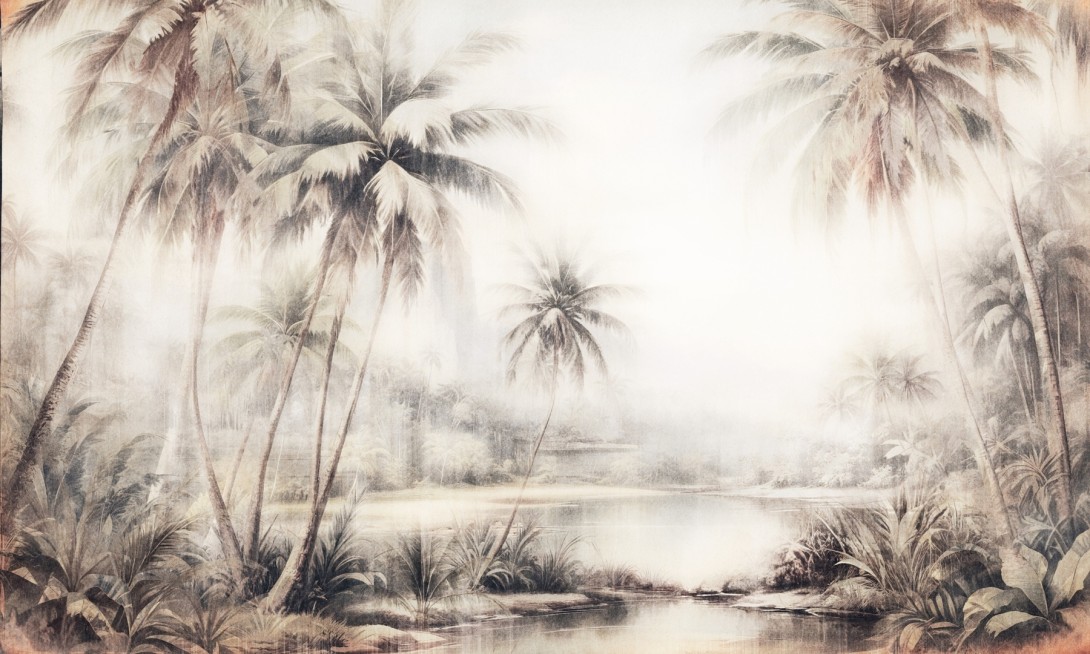 Mural Dekorami Tonga 1 przedstawia nastrojową scenerię tropikalnego lasu z gęstwiną palm i roślinności, utrzymaną w rozmytej, lekko przydymionej kolorystyce. Kompozycja została zaprojektowana z myślą o przestrzeniach, które potrzebują spójnego tła, ale również akcentu o silnym walorze estetycznym. Miękkie przejścia tonalne i organiczna forma palm wprowadzają do wnętrz poczucie przestronności i głębi. Delikatne sepia i piaskowe beże harmonizują z naturalnymi materiałami – drewnem, lnem czy kamieniem – co czyni ten model idealnym wyborem do aranżacji w stylu modern farmhouse oraz organic modern. Mural Dekorami Tonga 1 doskonale odnajduje się w salonach, gabinetach i hotelowych lobby. Dzięki swojej stonowanej, ale wyrazistej formie, wpisuje się zarówno w przestrzenie wypoczynkowe, jak i te o bardziej reprezentacyjnym charakterze.