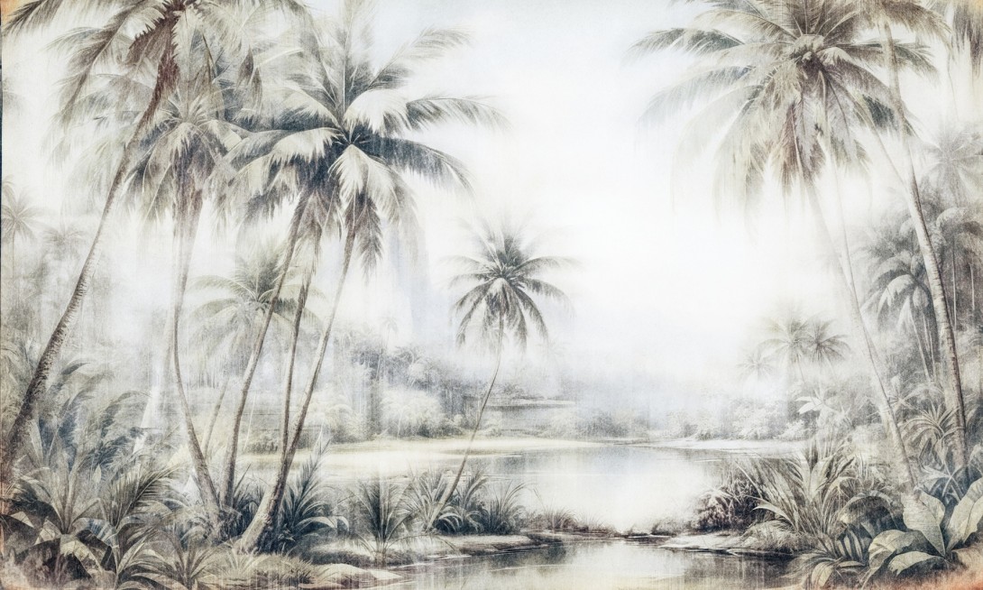 Mural Dekorami Tonga 2 emanuje tropikalnym pejzażem zdominowanym przez smukłe sylwetki palm i subtelne refleksy roślinności odbijające się w wodzie. Nasycony pastelowymi tonami beżu, zieleni i rozmytych szarości tworzy wizualną głębię bez zbędnej intensywności. Zastosowana technika graficzna nadaje całości charakteru vintage ilustracji, co przekłada się na wysoki poziom estetyki i uniwersalność w aranżacjach. Mural Dekorami Tonga 2 doskonale koresponduje z wystrojami w stylu japandi, organic modern oraz scandi-boho, wprowadzając spokój i miękką strukturę do przestrzeni. Idealny wybór do sypialni, pokojów gościnnych oraz butikowych przestrzeni komercyjnych, gdzie kluczowa jest równowaga między dekoracją a harmonią. Subtelność kolorystyki pozwala na łączenie z naturalnymi materiałami i nowoczesnym wyposażeniem bez ryzyka przeciążenia wnętrza.