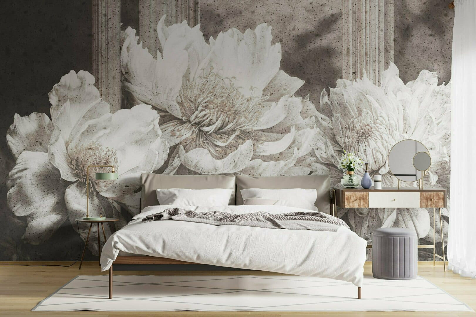 Mural Dekorami Tre Tenori 2 prezentuje realistyczne, makro kwiaty, które dzięki swojej trójwymiarowej kompozycji dodadzą ścianom głębi. Ujęcie ich na surowym tle wprowadzi do wnętrz interesujący kontrast. Dekoracja idealnie wpisuje się w aranżacje, które pragną łączyć naturalne akcenty z nowoczesnym stylem - doda przestrzeniom elegancji i wyrazistego charakteru. Pasuje do miejsc utrzymanych w duchu minimalizmu. Jej efektowny motyw doskonale prezentować będzie się w połączeniu z prostymi, eleganckimi meblami. Mural Dekorami Tre Tenori 2 jest idealnym rozwiązaniem do przestronnego salonu, nowoczesnej jadalni czy modnej przestrzeni komercyjnej.
