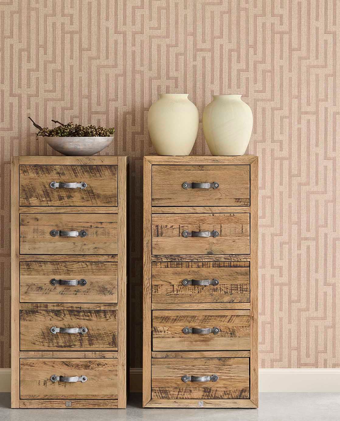 Tapeta Eijffinger Riviera Maison 350534 prezentuje nowoczesny motyw labiryntu, zbudowany z prostych, przecinających się linii ułożonych w rytmiczny, geometryczny układ. Wzór jest czytelny, ale subtelny – nadaje ścianie porządku i wizualnej głębi bez nadmiernej dekoracyjności. Tło o wyraźnej strukturze przypomina plecioną tkaninę, co wprowadza teksturę i naturalny akcent. Tapeta dobrze komponuje się z drewnem, kamieniem, lnem i prostymi formami, tworząc zrównoważoną całość. Tapeta Eijffinger 350534 Riviera Maison sprawdzi się w aranżacjach mid-century modern, japandi, nowoczesnych oraz klasycznych z geometrycznym detalem. To model, który porządkuje przestrzeń, podkreśla jej charakter i dodaje jej wyrafinowanej prostoty. Idealna do salonu, holu lub domowego gabinetu, gdzie liczy się rytm, forma i estetyczna spójność.