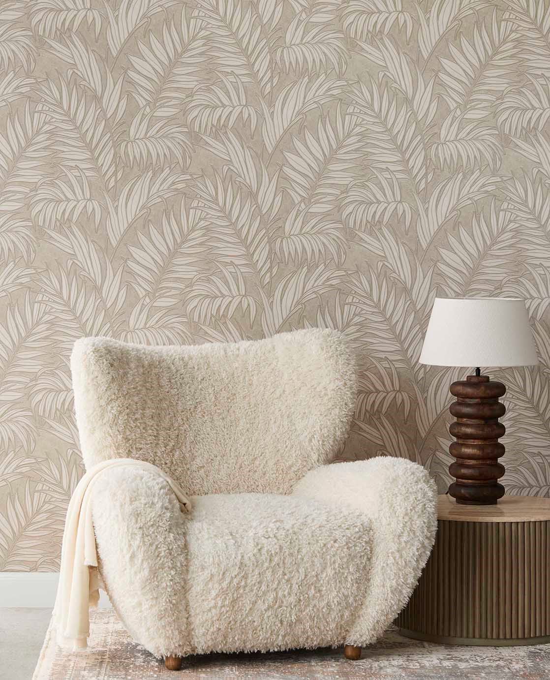 Tapeta Eijffinger Riviera Maison 350554 przedstawia motyw liści palmowych ułożonych w warstwową, dynamiczną kompozycję. Wydłużone kształty liści nachodzą na siebie, tworząc wyraźny rytm i wrażenie głębi. Cienka linia rysunku podkreśla kontur, a delikatnie fakturowane tło nadaje powierzchni subtelnej struktury. Wzór pozostaje spokojny i uporządkowany, dzięki czemu dekoracja dobrze współgra z naturalnymi materiałami i prostymi formami wyposażenia. Tapeta Eijffinger 350554 Riviera Maison doskonale pasuje do wnętrz w stylu klasycznym, rustykalnym, skandynawskim oraz śródziemnomorskim. To model, który wprowadza do przestrzeni organiczny rytm, wyciszenie i wizualną spójność. Idealny do salonu, sypialni lub strefy relaksu – wszędzie tam, gdzie liczy się detal inspirowany naturą i staranne wykończenie.
