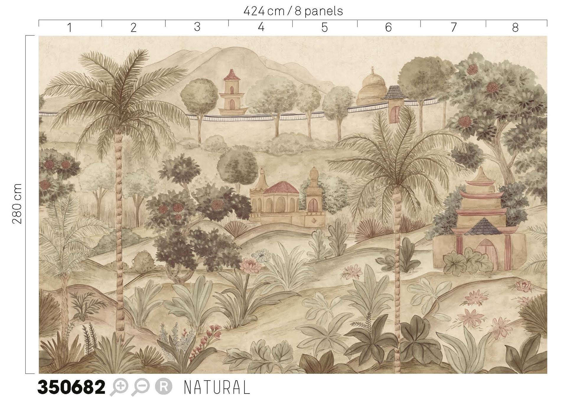 Mural Eijffinger Amber 350682 przedstawia orientalny pejzaż, w którym roślinność, architektura i ukształtowanie terenu tworzą harmonijną, wieloplanową kompozycję. Scena zaprojektowana jest z dbałością o proporcje i detale, dzięki czemu zyskuje dekoracyjny rytm i przestrzenny charakter. Mural wprowadza we wnętrzu efekt głębi oraz spokojnej, zbalansowanej narracji wizualnej. Mural Eijffinger 350682 Amber dobrze współgra z wyposażeniem w stylu naturalnym, kolonialnym lub eklektycznym – podkreśla materiały takie jak drewno, len czy rattan. Sprawdza się jako centralny punkt aranżacji w salonie, sypialni czy strefie wypoczynkowej, gdzie wnosi klimat podróży, wyciszenia i elegancji. Bogaty rysunek oraz wyraziste kontury budują spójną i estetycznie dopracowaną scenografię, która przyciąga wzrok, ale nie przytłacza. To propozycja dla osób poszukujących muralu o dekoracyjnym, a jednocześnie wyważonym charakterze.