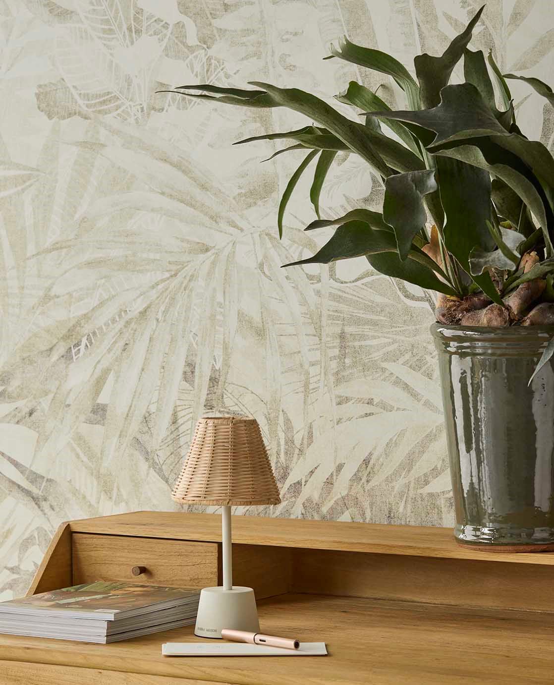 Mural Eijffinger Riviera Maison 350703 ukazuje egzotyczną roślinność w gęstej, tonalnie budowanej kompozycji, w której liście różnej wielkości i formy układają się warstwowo. Górna część wzoru pozostaje rozjaśniona, co optycznie podnosi wnętrze, natomiast dolna zyskuje intensywność i głębię. Taki układ nie przytłacza – sprzyja tworzeniu spokojnych, zrównoważonych aranżacji. Mural dobrze prezentuje się w zestawieniu z naturalnym drewnem, wikliną, matową ceramiką oraz tkaninami o wyrazistej strukturze. Mural Eijffinger 350703 Riviera Maison pasuje do wnętrz w stylu japandi, rustykalnym, boho oraz klasycznym. To dekoracja, która wspiera budowanie harmonijnych przestrzeni, dodaje botanicznego charakteru i porządkuje kompozycję – idealna do sypialni, salonu lub strefy wypoczynku.