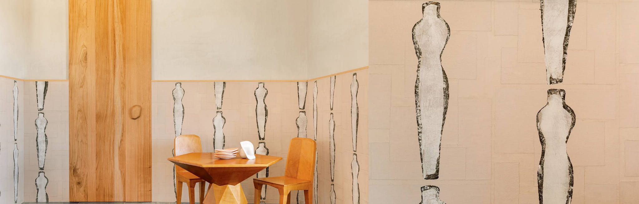 Tapeta Elitis RM 1031 05 Art Paper Naoshima przedstawia pionowy układ kobiecych postaci o płaskiej, stylizowanej formie z wyraźnie zaznaczoną rzeźbiarską narracją. Zbudowana z nakładających się papierowych wycinków, kompozycja operuje uproszczonym konturem i wydłużonymi liniami, które odwołują się do klasycznych motywów figuratywnych. Wycięte kształty pozostają surowe i niedopowiedziane, co wzmacnia artystyczny wydźwięk całości. Rytmiczne rozmieszczenie postaci oraz chropowata tekstura tła przywodzą na myśl płaskorzeźbę, osadzoną w wizualnym dialogu między cieniem a strukturą. Tapeta Elitis Art Paper Naoshima RM 1031 05 redefiniuje obecność kobiecej formy we wnętrzu, czyniąc ją częścią przestrzennej kompozycji o silnym charakterze. Wyrafinowanie wzoru dopełnia flizelinowy podkład, zapewniający estetyczną precyzję montażu i trwałość struktury.