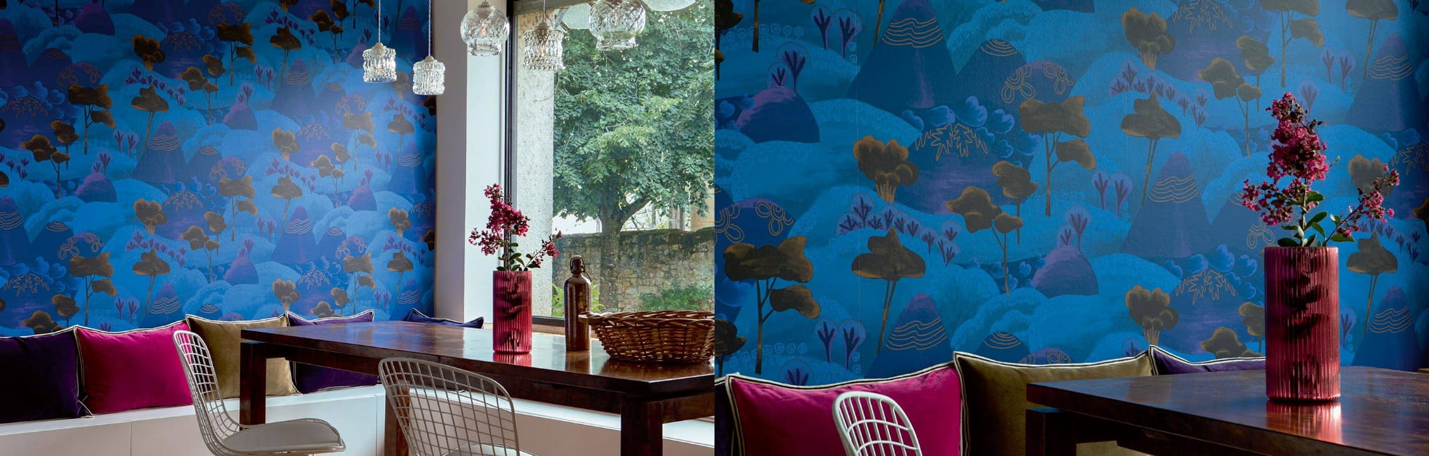 Tapeta Elitis Les petites histoires TP 323 03 Rêves de Manille to niezwykła dekoracja ścienna, pełna wdzięku i koloru, które przeniesie w malowniczy świat gór, otoczonych drzewami, krzewami i różnorodnymi motywami na szczytach. Ten projekt, zainspirowany sielskimi krajobrazami, wprowadzi do wnętrz botaniczny klimat, a intensywne kolory dodadzą ścianom niezapomnianego charakteru. Przepiękna tapeta w góry znakomicie odnajdzie się na najważniejszej ścianie w salonie, jadalni czy sypialni. Dzięki swojej odporności na działanie światła oraz trwałej ognioodporności jest także idealnym wyborem do pomieszczeń takich jak przedpokój czy hol. Można śmiało używać jej również w miejscach użyteczności publicznej. Kompozycja z górskim krajobrazem doskonale komponuje się z nowoczesnymi, eklektycznymi, orientalnymi, a także retro wnętrzami. Tapeta Elitis Les petites histoires TP 323 03 Rêves de Manille dostępna jest w sześciu wariantach kolorystycznych.