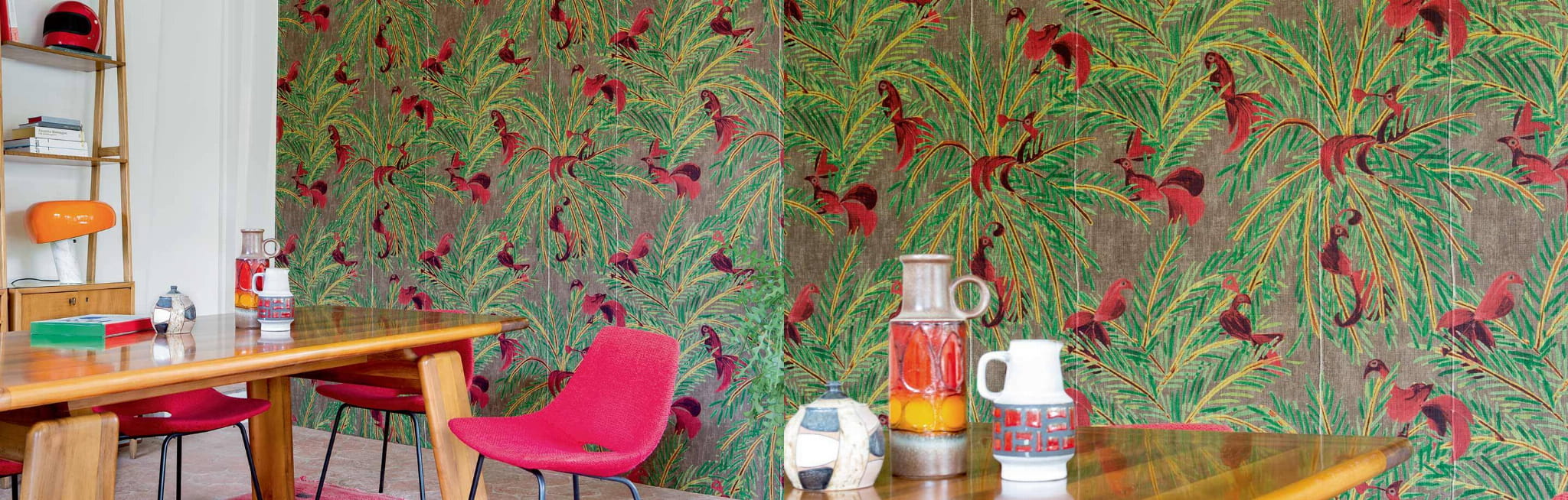 Tapeta Elitis Volver VP 923 03 La Californie zabierze w podróż do słonecznej Kalifornii, gdzie egzotyczne ptaki rozkoszują się na tropikalnych liściach palm, emanując radością i ciepłem. Ten projekt pełen życia został naniesiony na podłoże o wyczuwalnej strukturze rafii, co nadaje pomieszczeniom wyjątkowego uroku i przytulności. Tropikalna tapeta świetnie odnajdzie się na ścianie akcentowej, doskonale komponując się z innymi, bardziej stonowanymi wzorami z katalogu. To doskonały wybór zarówno do nowoczesnych, jak i eklektycznych czy klasycznych wnętrz. Wierzchnia warstwa tapety z motywem ptaków i palm pokryta jest winylem, co sprawia, że jest łatwa do czyszczenia i wyjątkowo odporna na plamy i uderzenia. Tapeta Elitis Volver VP 923 03 La Californie dostępna jest w czterech wariantach kolorystycznych.