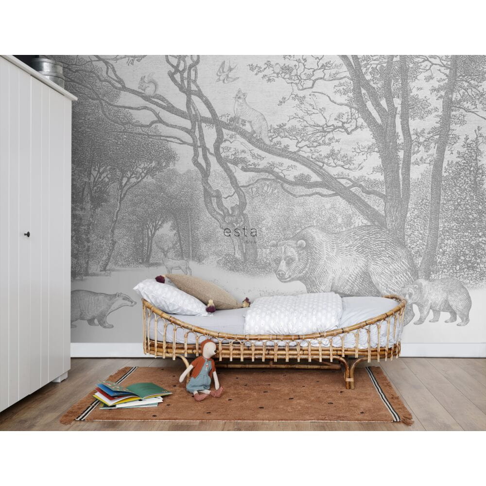 Duży brunatny niedźwiedź i jego młode przechodzące powoli obok, wiewiórka skacząca z drzewa na drzewo uciekająca przed przebiegłym lisem i ciekawski szop, który zatrzymuje się, żeby się przywitać. Te zabawne leśne zwierzęta zamieniają dziecięcy pokój w piękny bajkowy las. Kolekcja tapet Esta Forest Friends zamieni pokój Twojego malucha w cudowną przestrzeń, którą pokocha.