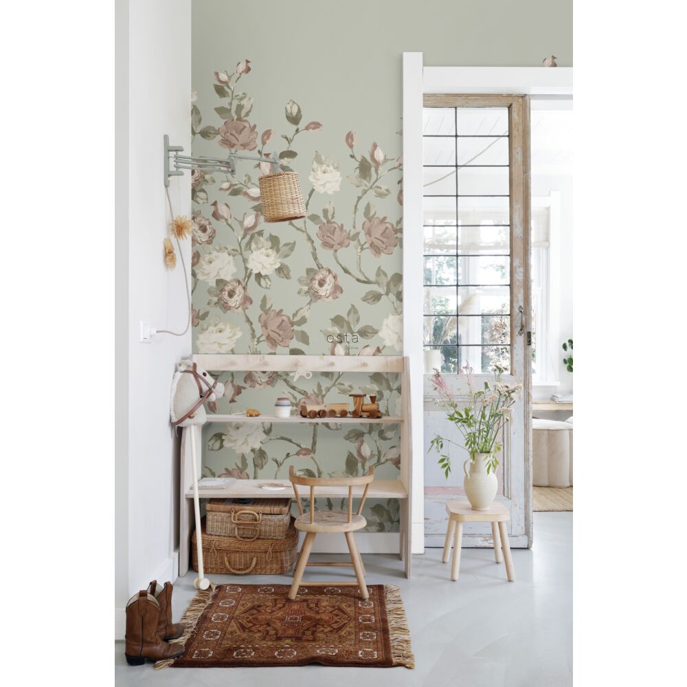 Mural Esta Vintage Flowers grayed mint green and antique pink 159213 to romantyczna dekoracja z bukietami kwiatów, która doda wnętrzu ciepła i charakteru. Romantyczny wygląd to eklektyczny styl, który łączy antyczne meble z pastelowymi kolorami, lnem, koronkami i pięknymi kwiatami. Ten wzór w stylu vintage to absolutny must have, jeśli kochasz ten delikatny i marzycielski styl. Mural Esta Vintage Flowers grayed mint green and antique pink 159213 ożywi ściany i wprowadzi do Twojego wnętrza ciepłą i romantyczną atmosferę.
