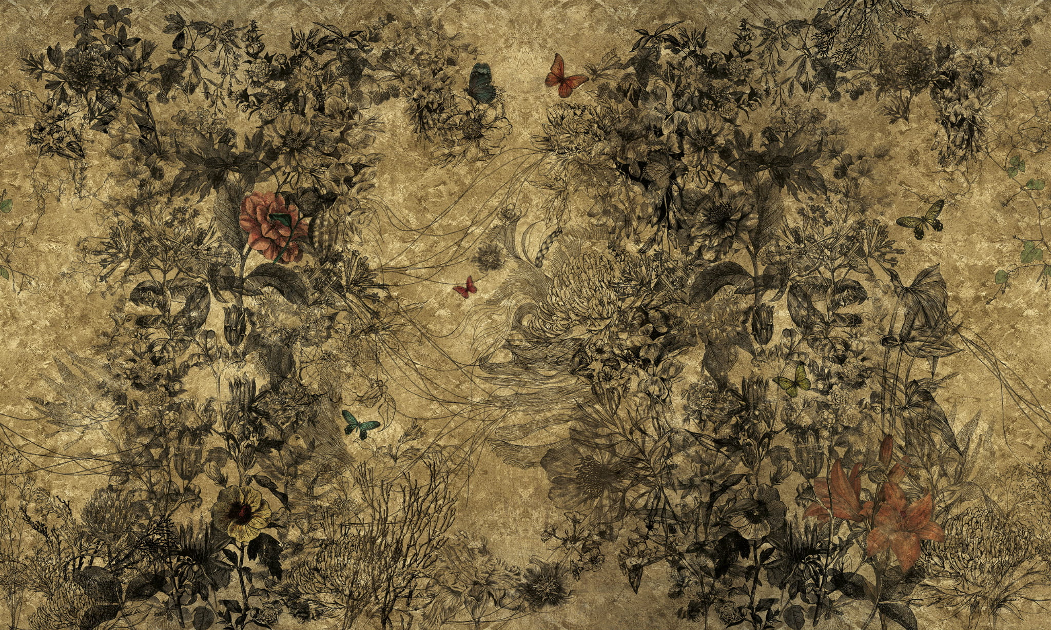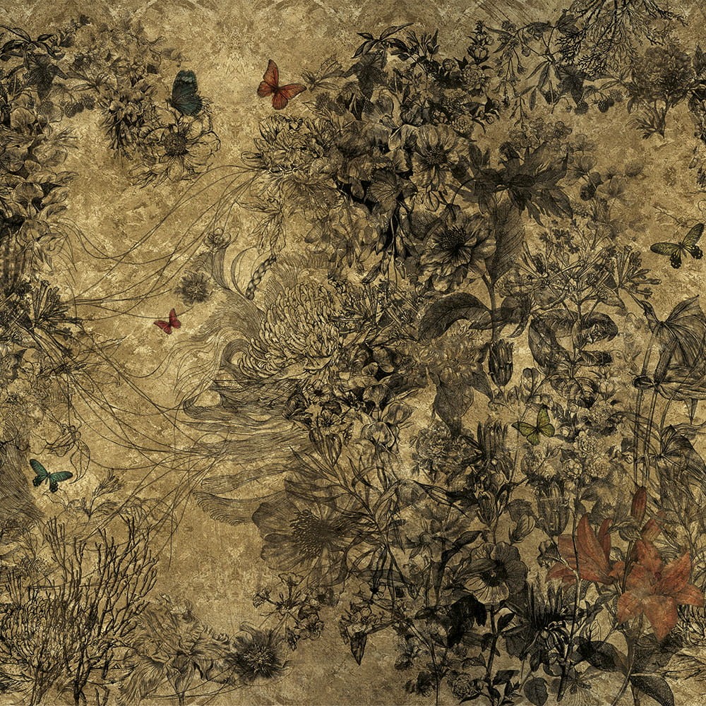 Fototapeta Inkiostro Bianco Goldenwall 2020 April INKLVIC2001 autorstwa włoskich projektantów to ekskluzywna dekoracja zapewniająca fascynujące doznania wzrokowe. Efektowny wzór przenosi nas na łono połyskującej złotem przyrody z pięknymi okazami kwiatów i motyli. Kolorystyka mieni się odcieniami najcenniejszego kruszcu, wprowadzając do wnętrz magiczną atmosferę. Nutki ożywienia dodają stonowane, lecz przyciągające wzrok barwy roślinności i owadów. Mural Inkiostro Bianco Goldenwall 2020 April INKLVIC2001 będzie wspaniałym uzupełnieniem eleganckiej aranżacji klasycznej w pomieszczeniach domowych oraz w miejscach użyteczności publicznej. Doskonale prezentuje się w towarzystwie białych i szarych dodatków.