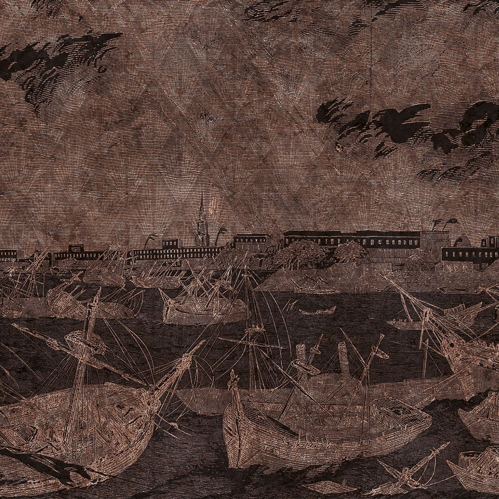 Fototapeta Inkiostro Bianco Goldenwall 2020 Calcutta INKCSPR2003 to wyjątkowo piękna dekoracja ścienna wykonana na winylowym podłożu, pokrytym pozłacaną warstwą, która nadaje wnętrzom eleganckiego charakteru. Na pierwszym planie widzimy wraki pięknych żaglowców, które powoli pochłaniają ciemne wody Gangesu. W tle wznoszą się antyczne budowle starożytnego miasta. Całość buduje charakterystyczną atmosferę tajemniczości. Ozdobny efekt tworzą kształty wachlarzy mieniące się złocistym blaskiem. Kolorystyka utrzymana jest w barwach różowego złota w połączeniu z ciemnoszarymi przebłyskami. Mural Inkiostro Bianco Goldenwall 2020 Calcutta INKCSPR2003 wpisuje się we wnętrza nowoczesne, jak i klasyczne.