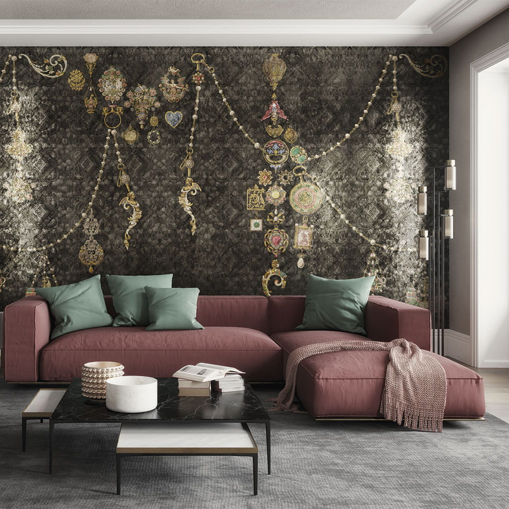 Fototapeta Inkiostro Bianco Goldenwall 2020 Gioielli INKLMGP2001 to wspaniała dekoracja pozwalająca na wprowadzenie do pomieszczeń naszego domu lub mieszkania szlachetnej atmosfery i elegancji. Wzór przedstawia drogocenne klejnoty na artystycznym, wypełnionym ozdobnymi wzorami tle. Niezwykle atrakcyjny efekt tworzy warstwa połyskującego winylu. Bogata kolorystyka zdominowana jest przez barwy złota z pojawiającymi się tu i ówdzie kolorowymi akcentami biżuterii. Mural Inkiostro Bianco Goldenwall 2020 Gioielli INKLMGP2001 doskonale komponuje się w otoczeniu pastelowych barw elementów wyposażenia we wnętrzach pokoju dziennego sypialni lub przedpokoju urządzonych w stylu skandynawskim oraz glamour.