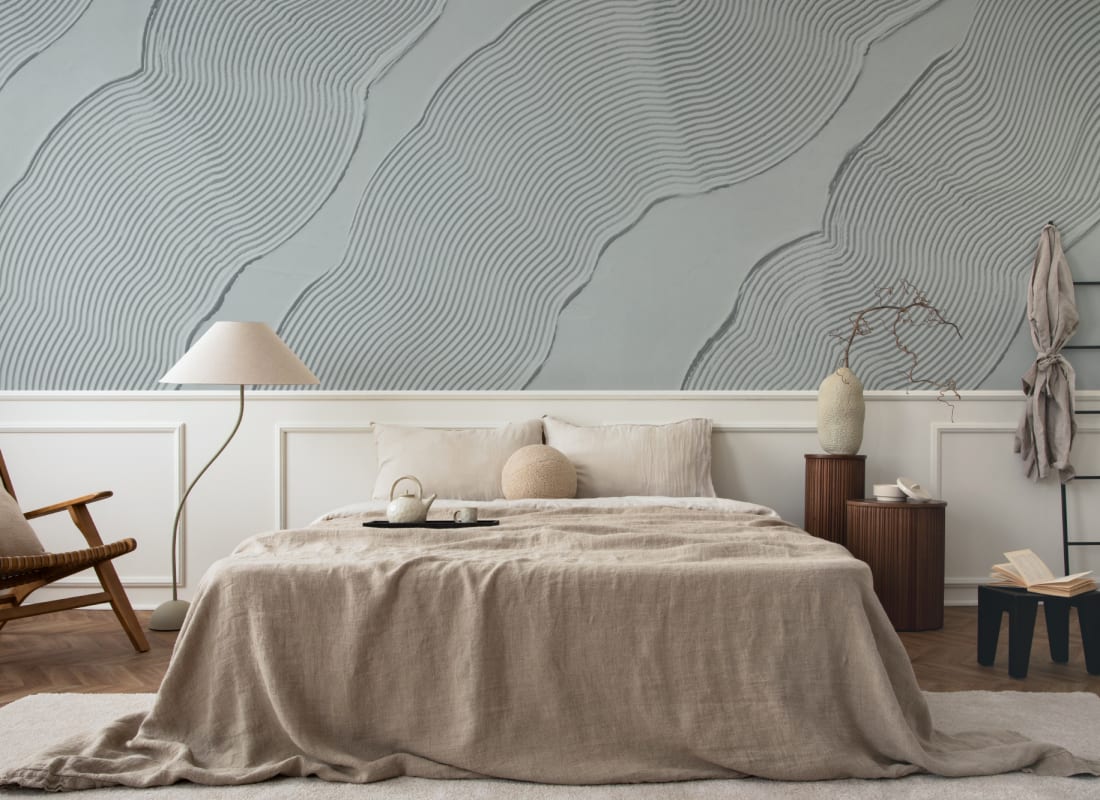 Mural Hovia Sculpt Blue AB0426BU04W przedstawia wyrafinowaną interpretację naturalnych form w miękkim, niebieskoszarym odcieniu. Dekoracja bazuje na ręcznie kształtowanej powierzchni, której warstwowy rytm został precyzyjnie wyrzeźbiony i sfotografowany w technice oddającej głębię oraz cieniowanie materiału. Organiczne linie płynnie przesuwają się przez całą kompozycję, tworząc subtelny efekt ruchu. Model Hovia AB0426BU04W Sculpt Blue doskonale wpisuje się w estetykę japandi, organic modern i nowoczesnego minimalizmu – kierunków, które łączą spokój z architektoniczną czystością. Do sypialni lub pokoju gościnnego wprowadzi wyważoną atmosferę – sprzyjającą relaksowi i wizualnemu uporządkowaniu przestrzeni. To mural, który nie zdominuje wnętrza, lecz dyskretnie je zorganizuje, opierając się na harmonii kształtów i chłodnej palecie. Wzór ten łączy rzemieślniczą precyzję z nowoczesnym podejściem do struktury i koloru.