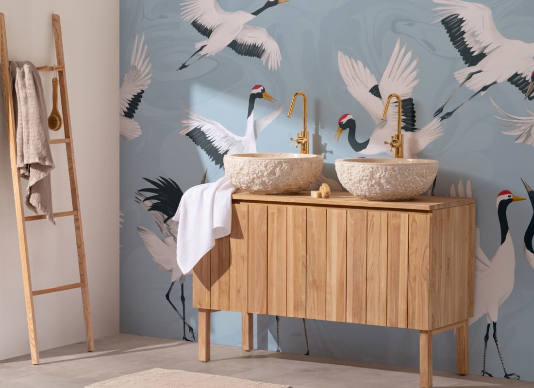 Mural Hovia Tancho Blue AN0053BU03W wykorzystuje estetykę inspirowaną tradycyjną grafiką japońską, wprowadzając motyw dynamicznych żurawi na tle w odcieniu chłodnego błękitu. Model eksponuje kontrast między geometrycznym układem skrzydeł a płynnym, marmurkowym wzorem tła, co nadaje kompozycji głębi i harmonii. Detale, takie jak czerwone korony ptaków czy intensywna czerń piór, wzmacniają artystyczny i graficzny charakter dekoracji. Mural Hovia AN0053BU03W Tancho Blue sprawdza się w nowoczesnych, ale i klasycznych wnętrzach, budując atmosferę spokoju i lekkości. Może stanowić intrygujące tło dla strefy wypoczynkowej, domowej biblioteki lub sypialni, gdzie kluczowe są wizualna równowaga i wyrafinowanie. Dzięki neutralnej kolorystyce i oryginalnemu rytmowi kompozycyjnemu wprowadzi do przestrzeni nutę orientalnej elegancji.
