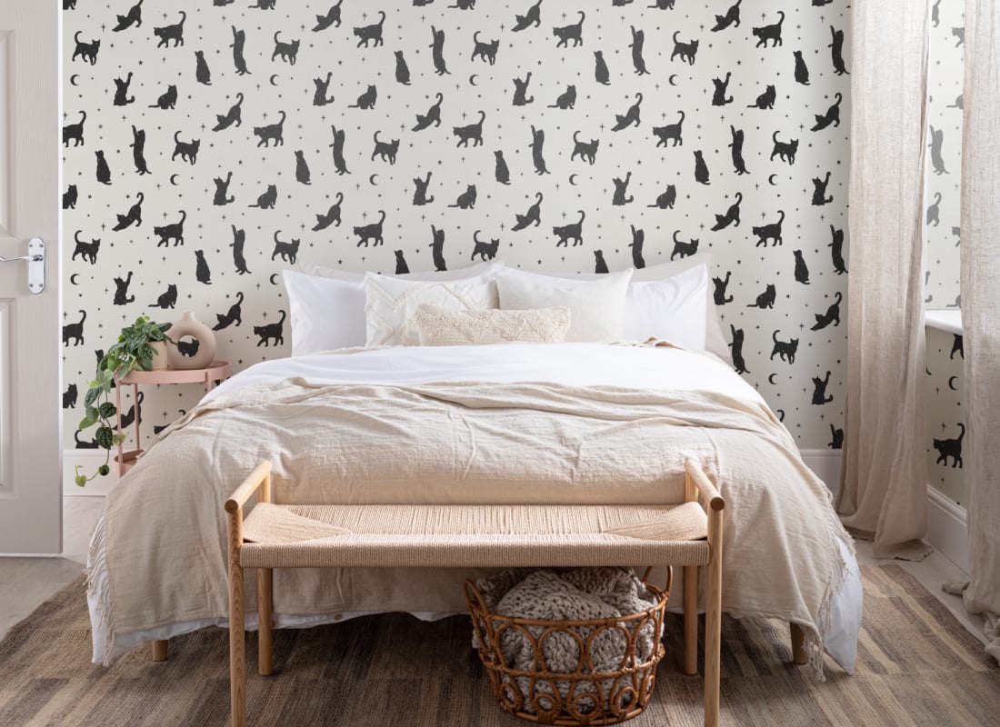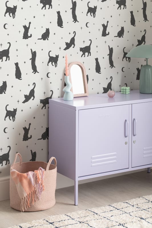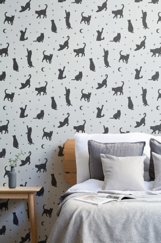 Mural Hovia Salem AN5028WH03W przedstawia rytmiczny wzór sylwetek czarnych kotów, uzupełnionych detalami w postaci półksiężyców i gwiazd, rozmieszczonych na jasnym tle w odcieniu bieli. Kontrastująca grafika autorstwa Lauren Martin bazuje na prostych formach, tworząc układ przyjemny wizualnie i łatwy do zintegrowania z wieloma aranżacjami. Czerń w ilustracjach została zrównoważona pastelowym tłem, co nadaje tapecie wyrazistości bez nadmiernego ciężaru optycznego. Mural Hovia AN5028WH03W Salem dobrze współgra z naturalnymi materiałami, jasnym drewnem, beżami i tekstyliami o delikatnej fakturze. Styl wzoru odpowiada aktualnym trendom minimalistycznym i skandynawskim, sprawdzi się w salonie, sypialni lub jadalni. Wprowadzi do wnętrza lekkość, indywidualny charakter i subtelny motyw graficzny, który przyciąga wzrok, ale nie dominuje przestrzeni.