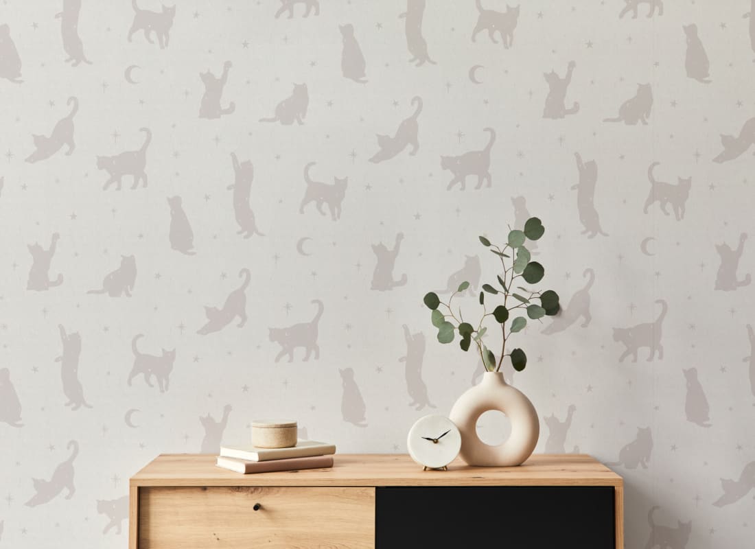 Mural Hovia Salem Neutral AN5520NE03W przedstawia subtelny wzór kotów rozmieszczonych w rytmicznym układzie na jasnym tle z delikatnym nadrukiem gwiazdek i półksiężyców. Kompozycja oparta na neutralnej palecie zapewnia spokojny odbiór wizualny, jednocześnie wprowadzając do wnętrza graficzną strukturę. Dekoracja bazuje na minimalistycznym stylu ilustracji, który umożliwia łatwe zestawienie z naturalnymi materiałami, miękkimi tekstyliami i prostą geometrią mebli. Mural Hovia AN5520NE03W Salem Neutral doskonale sprawdzi się w salonie, sypialni lub jadalni, gdzie zbuduje tło dla aranżacji opartych na stonowanej kolorystyce i detalach o organicznej fakturze. Produkt równoważy prostotę z ilustracyjną lekkością, tworząc przestrzeń sprzyjającą relaksowi i wyciszeniu. Dzięki swojej uniwersalnej formie pasuje zarówno do nowoczesnych, jak i klasycznych koncepcji wnętrzarskich.